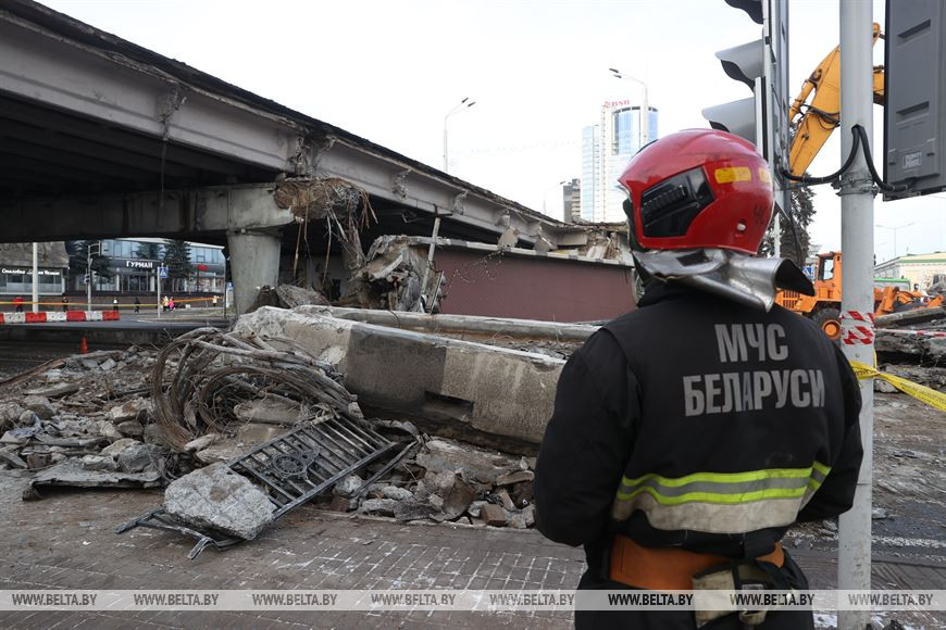 Обрушение пешеходной части моста на пересечении пр.Победителей и ул.М.Богдановича (станция метро "Немига") - серьезное происшествие и испытание для городской инфраструктуры.
