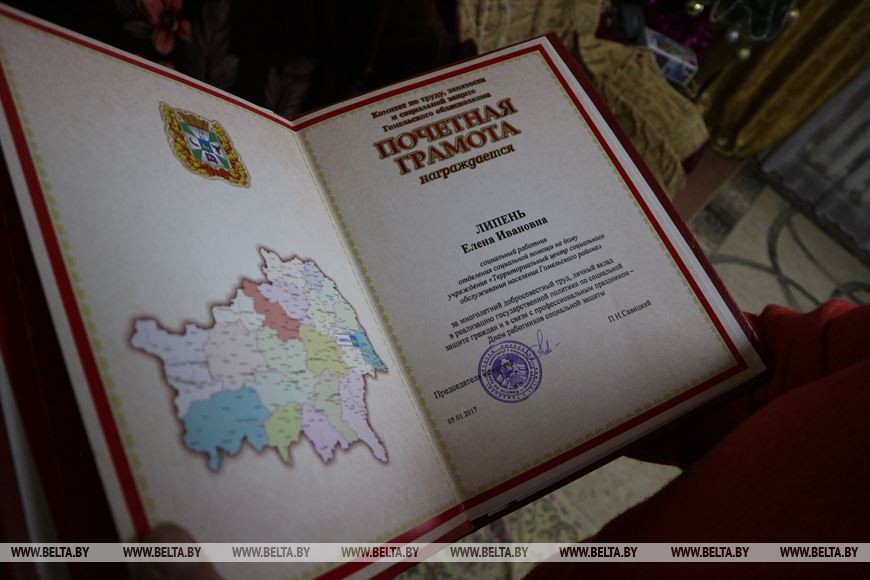 Елена Липень и не скрывает: работа непростая, да и не для каждого. "За каждой дверью ждет человек со своей судьбой, у многих очень яркий и нелегкий путь и вместе с тем их подтачивает чувство одиночества. К тому же возраст берет свое", - говорит она. И каждый год укрепляет связь между соцработником и односельчанами, со многими сложились такие отношения, что не у всех родственников такие. Это, как и улыбки подопечных, тоже придает сил. Впрочем, работу Елены Липень ценит и руководство: многочисленные почетные грамоты и благодарности она бережно хранит в папке, а вот документ за подписью министра труда и социальной защиты висит на видном месте.