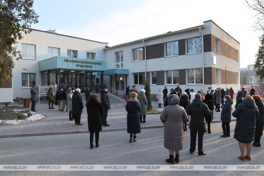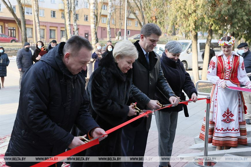 Символическую красную ленточку перерезали министр труда и социальной защиты Ирина Костевич, председатель Мингорисполкома Владимир Кухарев, председатель комитета по труду, занятости и социальной защите Мингорисполкома Жанна Романович и гендиректор ОАО "Стройтрест №1" Владимир Бублик.