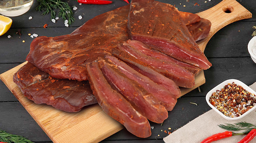 Мясной продукт "Брезаола изысканная". Поверьте, попробовав всего однажды, вы никогда не забудете вкус сыровяленого деликатеса из говядины. Почему? Все гениальное просто: в его составе исключительно натуральные ингредиенты – от нежнейшей говяжьей пашины до специй и приправ. Красная паприка, белый перец, чили, сушеные лук и томат раскрывают вкус вяленого мяса, а экстракты черного перца и розмарина придают ему пикантный аромат.
