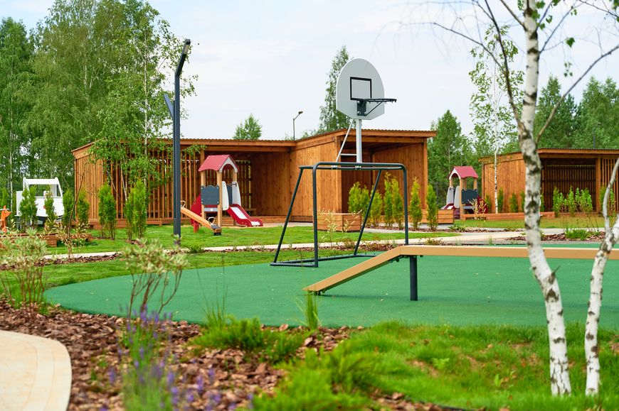На территории садика - обилие взрослых деревьев. Дорожки, детские площадки размещали так, чтобы их сохранить. Тем самым передали впечатление, будто детский садик здесь уже давно. Деревья не только придают завершенный вид, они будут влиять на правильное эмоциональное состояние детей, а также служить дополнительным источником тени для малышей.