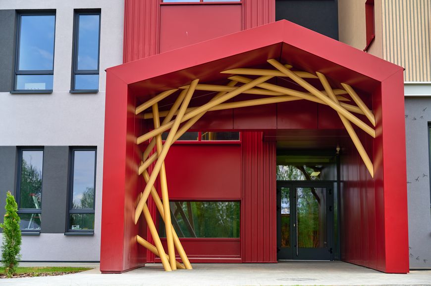 Концепция детского сада продиктована близостью природного заказника "Стиклево", где обитают в том числе редкие и охраняемые виды птиц Беларуси. Пространство дошкольного учреждения перекликается с окружающей средой, птицами, которые и стали лейтмотивом в оформлении здания. Фасад украсили декоративные скворечники, а входную группу превратили в настоящее птичье гнездышко.