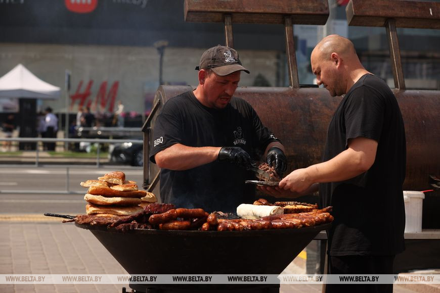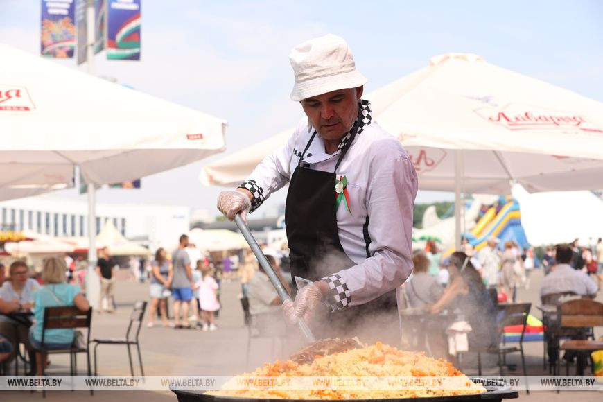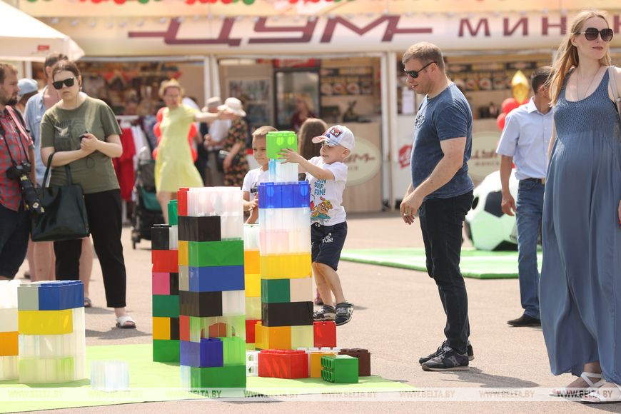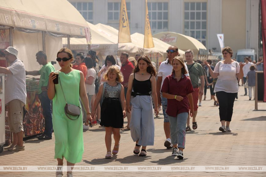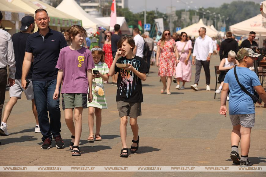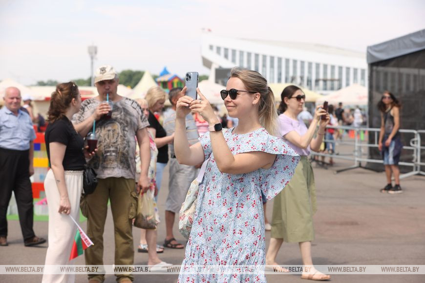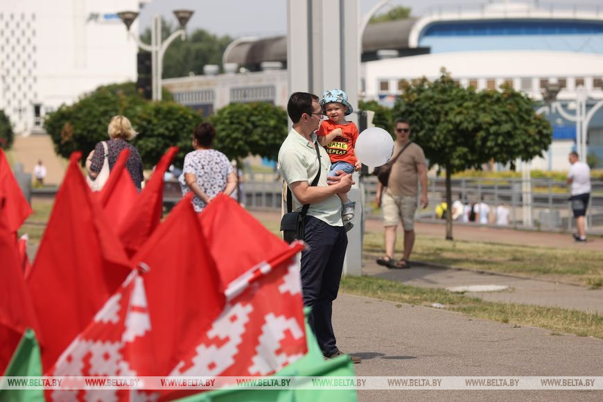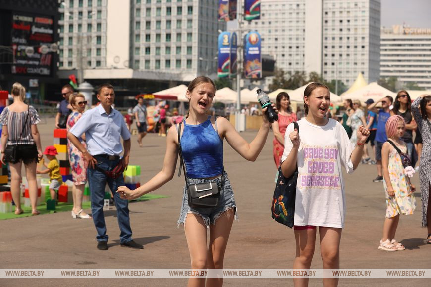 Аномально жаркая погода не останавливала жителей и гостей столицы, которые в большом количестве приходили ко Дворцу спорта. Празднование одного из главных государственных праздников традиционно объединяет белорусов всех поколений - дети, молодежь, взрослые и пожилые. На площадке у Дворца спорта было где отдохнуть: для посетителей выставляли палатки с едой и напитками и организовали выставку-ярмарку народного творчества.
