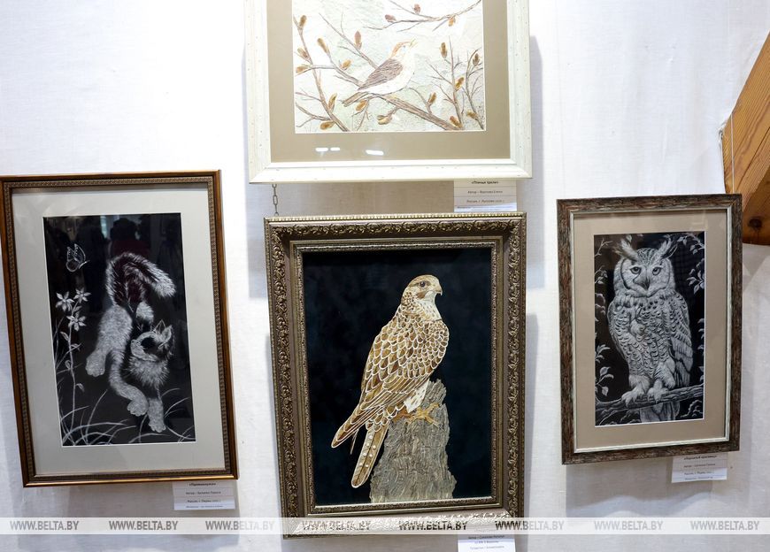 Одной из любопытных техник является рисунок пухом. Здесь используют тополиный, хлопковый, пух иван-чая, при этом мастера не применяют клей. Руководитель народного коллектива любительского художественного творчества - клуба мастеров флордизайна "Фантазия" Татьяна Соколова (Санкт-Петербург) раскрыла некоторые секреты работы с таким тонким материалом. "Пух наносится на бархатную бумагу. Он вбивается пальцами и не применяется больше никаких других инструментов. Для эффекта прозрачности используется меньше пуха, для придания цвета - больше. Более длинный пух иван-чая можно скручивать в тонкие жгутики и вбивать их в рисунок для четкого контура. Также два раза в год пух дает и ива. Все это мы сами заготавливаем, чтобы потом в любое время можно было работать над такими картинами", - подчеркнула она.
