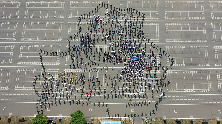 Десантники выстроились в фигурную линию, изображая контуры Республики Беларусь. Остальные участники заполнили очерченное пространство таким образом, чтобы обозначить все областные центры страны.