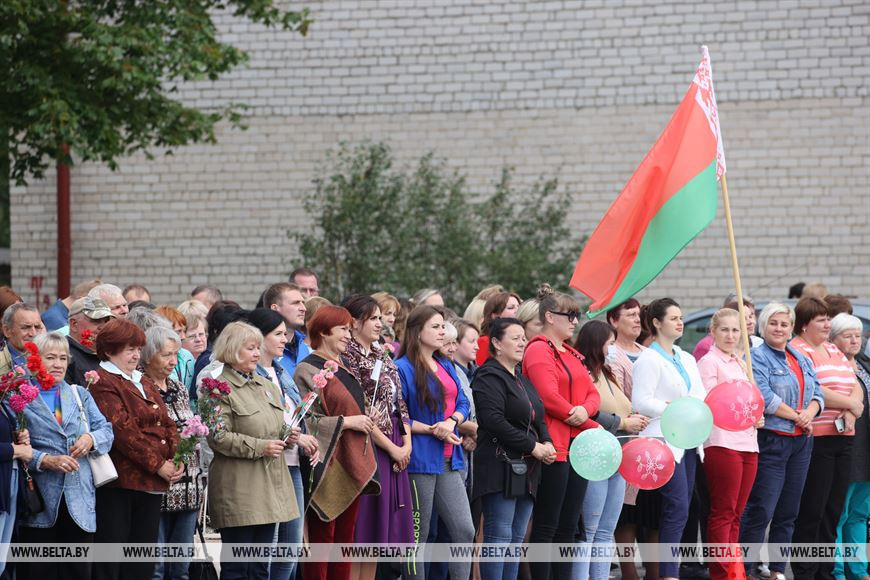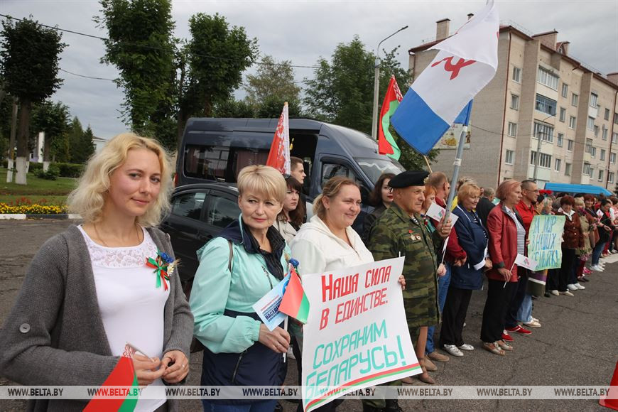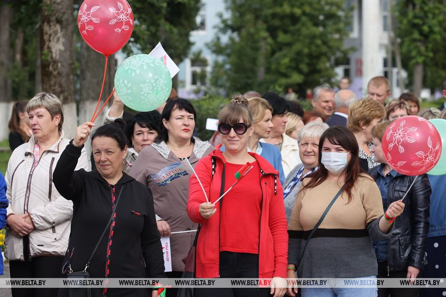 На митинг в центре Волковыска люди пришли с государственными флагами, плакатами, красными и зелеными шарами. К собравшимся обратились представители местной власти, профсоюзов, общественных объединений и просто неравнодушные люди.