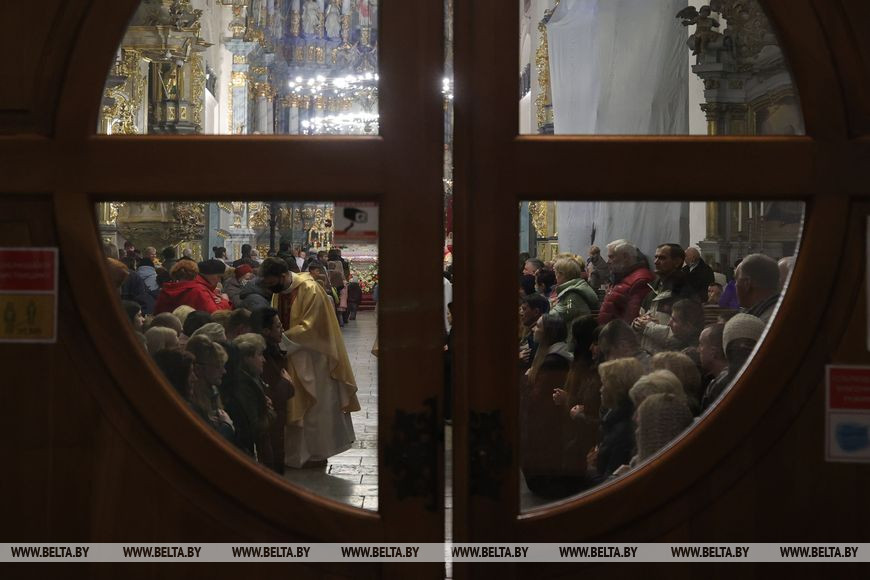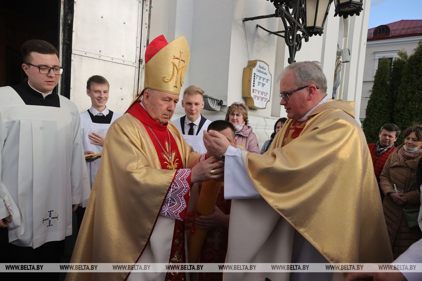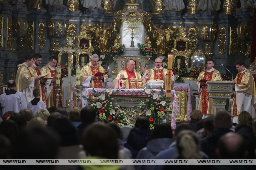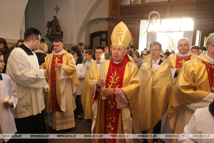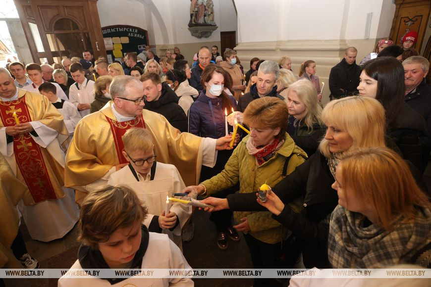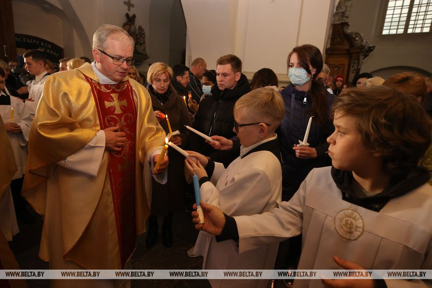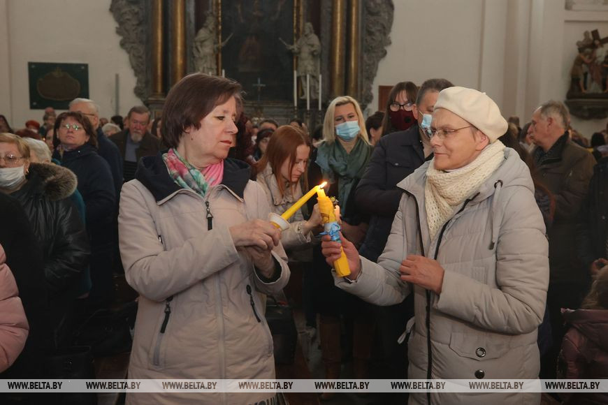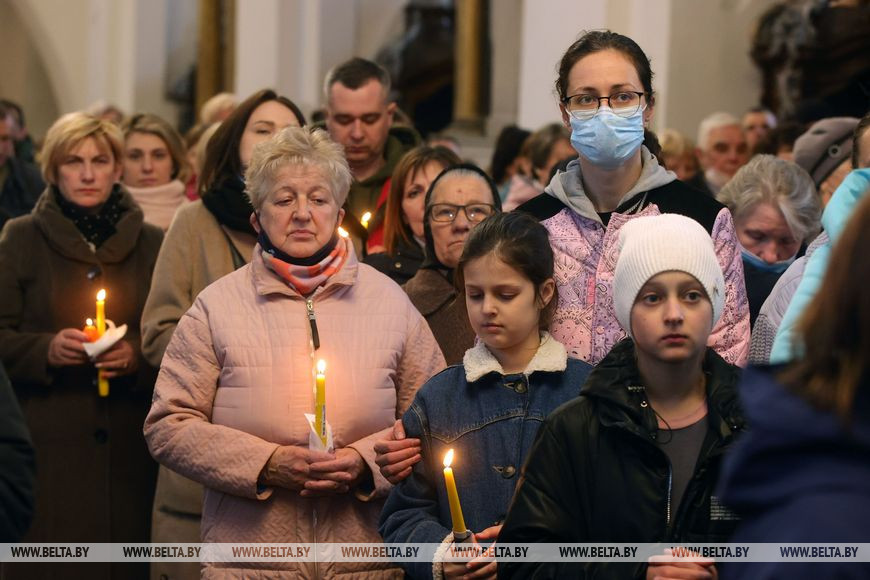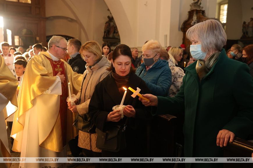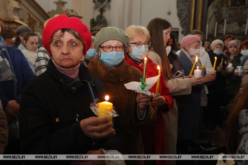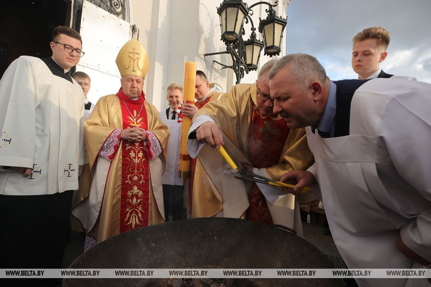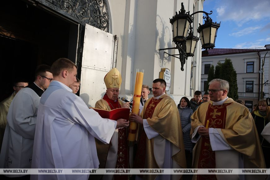 16 апреля, Минск /Корр. БЕЛТА/. В Фарном костеле в Гродно 16 апреля прошло главное пасхальное богослужение - Навечерие Пасхи. Католические церкви проводят его вечером в Великую субботу. По традиции перед храмами разводят костры, от которых зажигают пасхал - большую свечу, символизирующую воскрешение Иисуса Христа. Прихожане зажигают свои свечи от пасхала. От него же зажигают и все свечи в храме.-0-