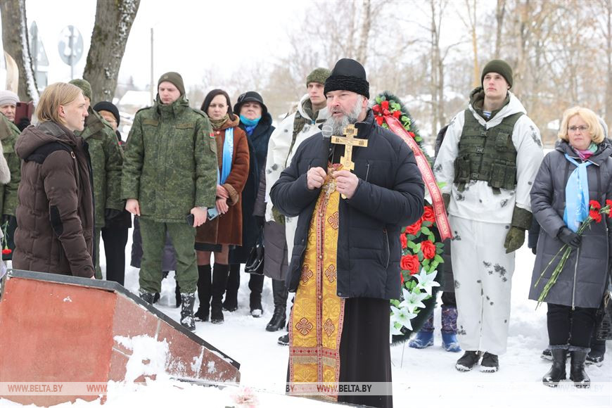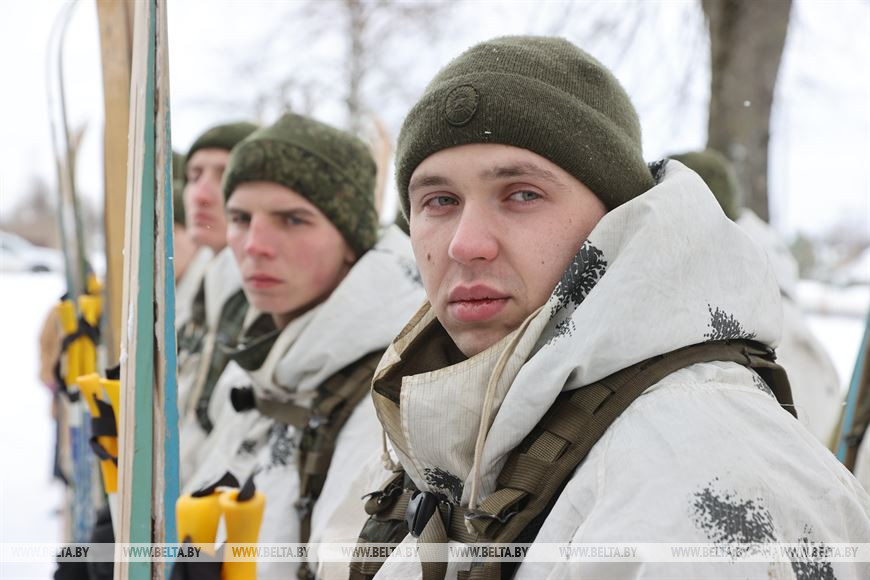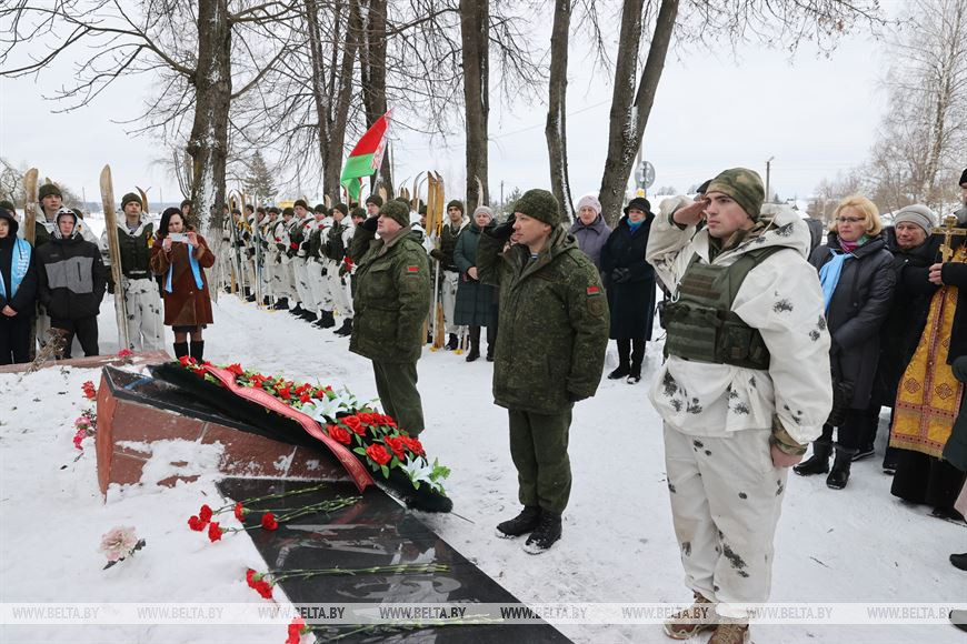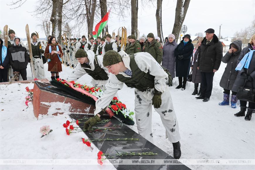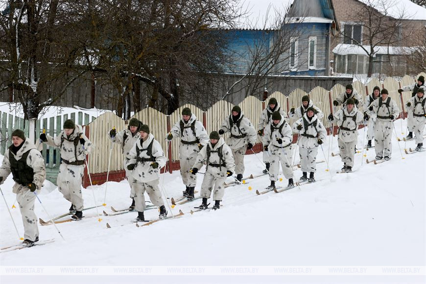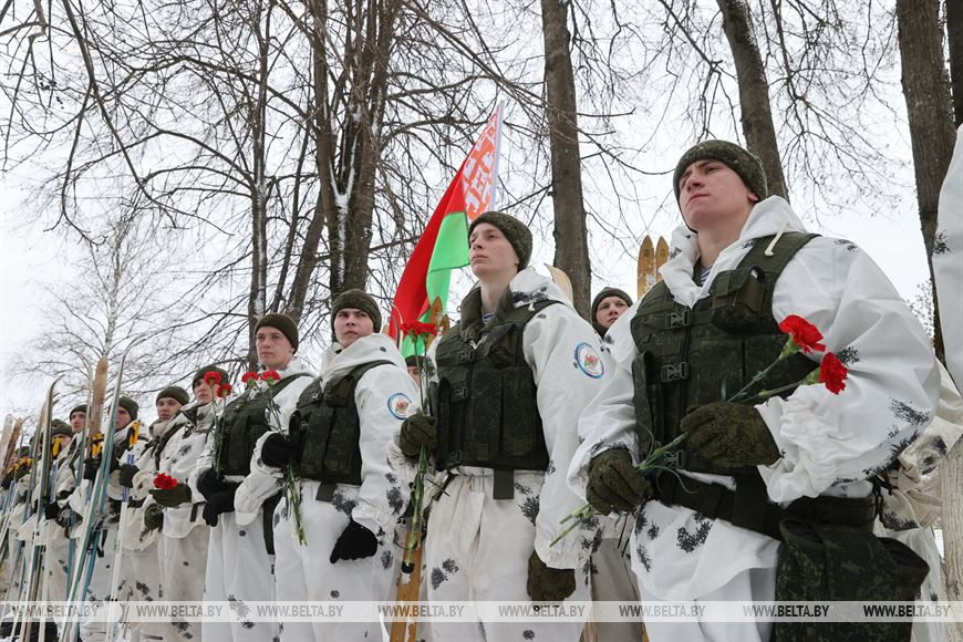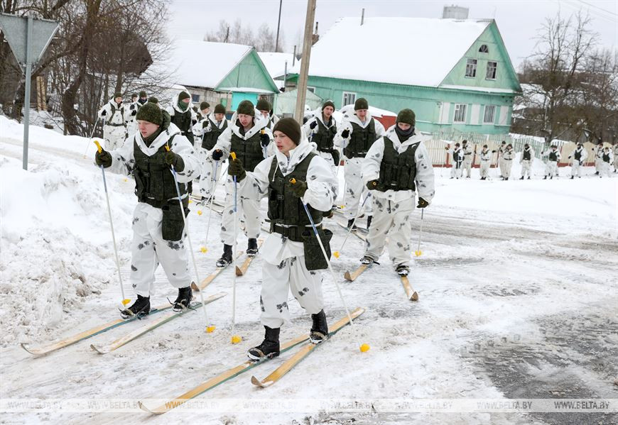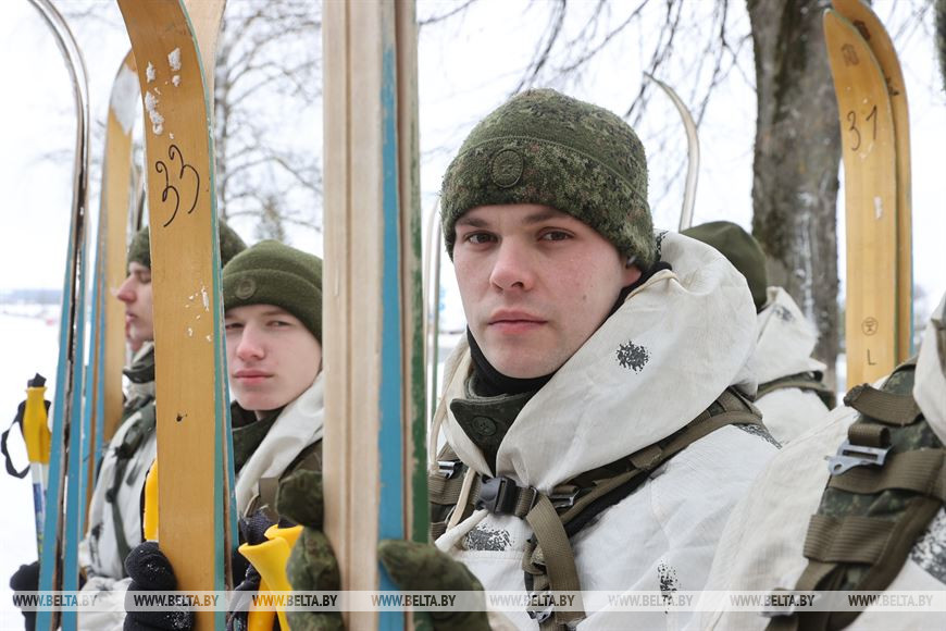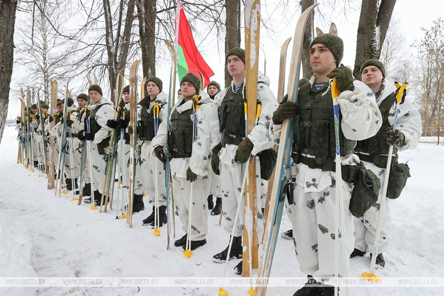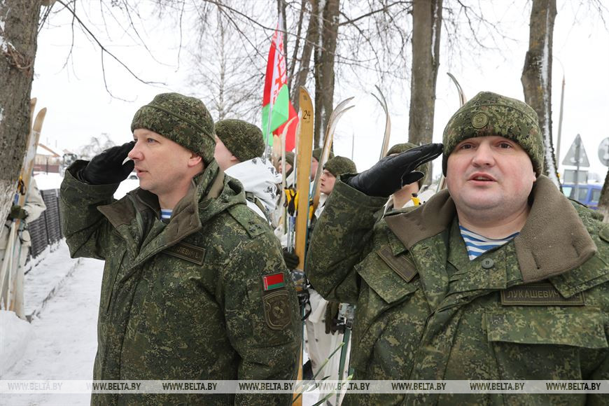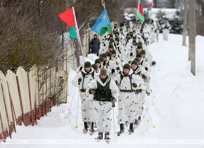 20 февраля, Витебск /Корр. БЕЛТА/. В честь 105-летия Вооруженных Сил Республики Беларусь личный состав 103-й Витебской отдельной гвардейской воздушно-десантной бригады с 19 по 21 февраля проводит лыжный переход по памятным местам Витебского и Лиозненского районов. В поход отправились 105 витебских десантников. Военнослужащие за три дня преодолеют дистанцию в 105 км, ночевать они будут в лесу в палатках. В заданных точках маршрута их будет ждать полевая кухня с горячим обедом. 20 февраля десантники дошли до агрогородка Вороны Витебского района, где состоялся митинг с возложением цветов к воинскому захоронению времен Великой Отечественной войны.-0-
