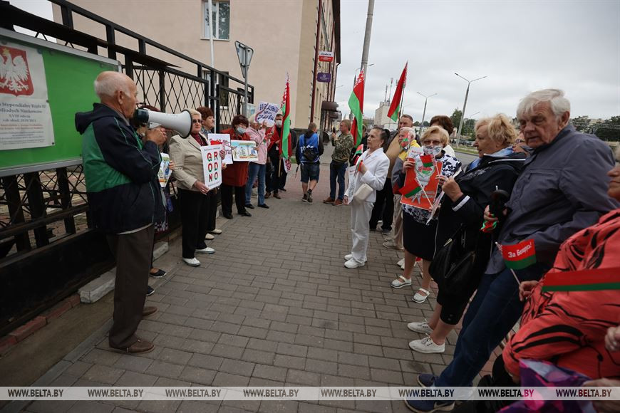 2 сентября, Гродно /Корр. БЕЛТА/. Представители городских ветеранских организаций 2 сентября провели акцию "Руки прочь от Беларуси" у Генерального консульства Республики Польша в Гродно. На пикете также присутствовали представители молодежи, сообщает корреспондент БЕЛТА.