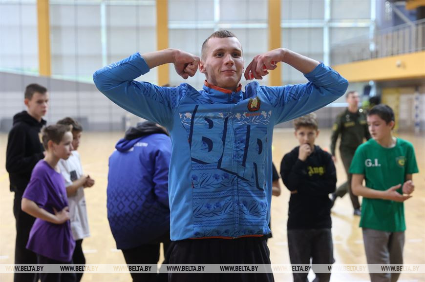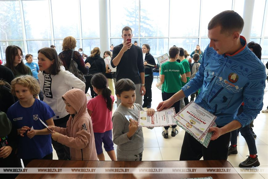 22 октября, Минск /Корр. БЕЛТА/. Во Дворце игровых видов спорта "Уручье" пятиборец Никита Иваровский принял участие в проекте "В мире армейского спорта". Дети из социально-педагогических центров Минска пообщались со спортсменом и поучаствовали в спортивном празднике.-0-