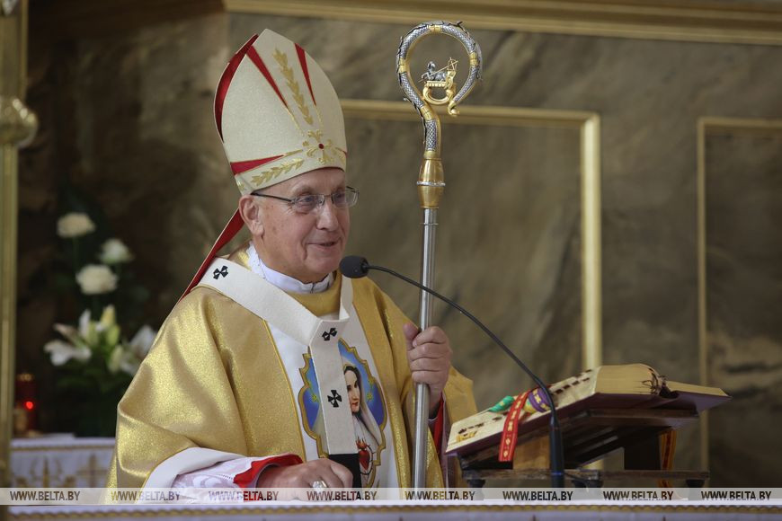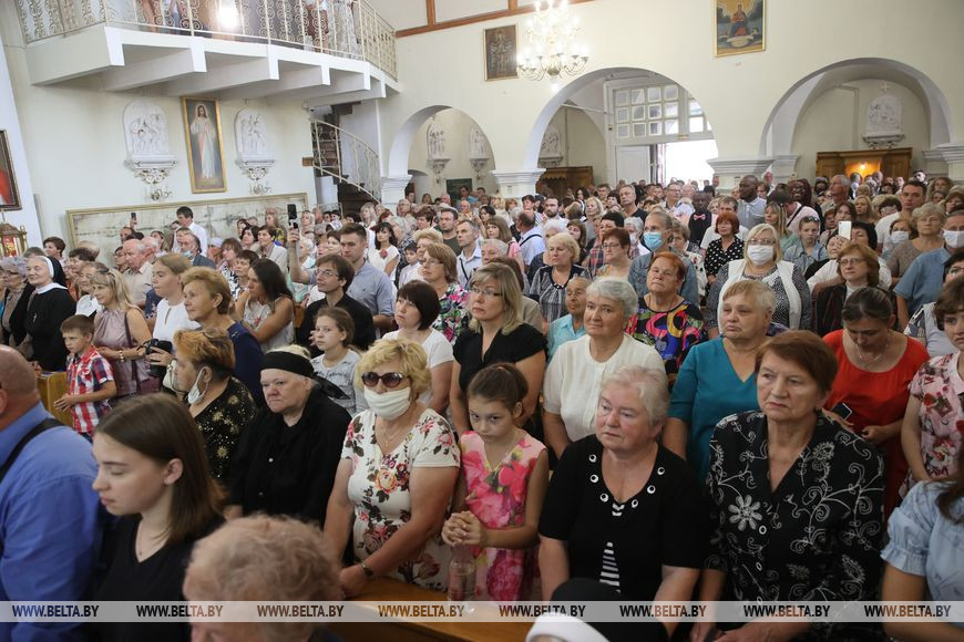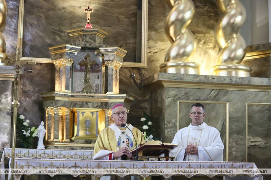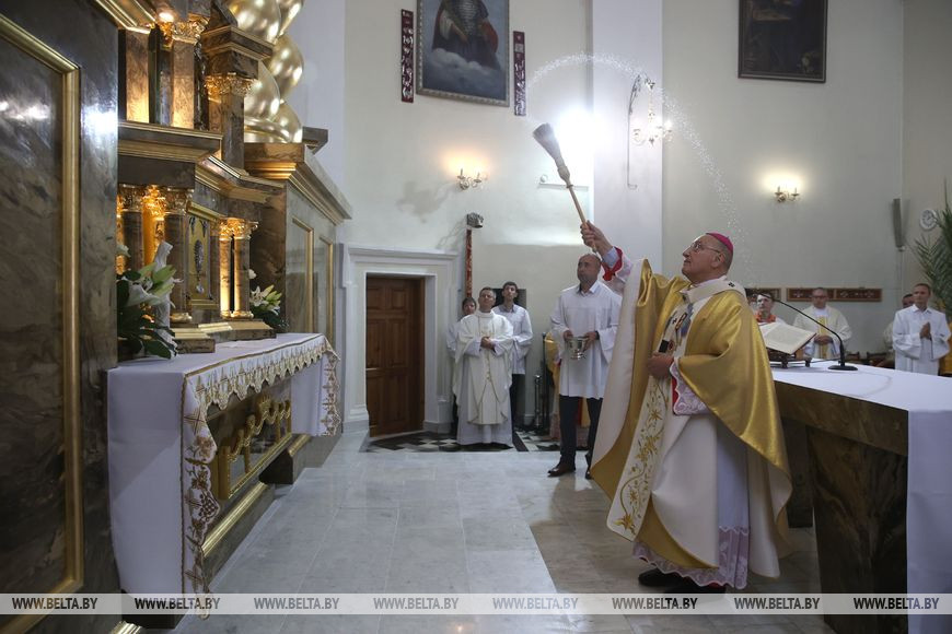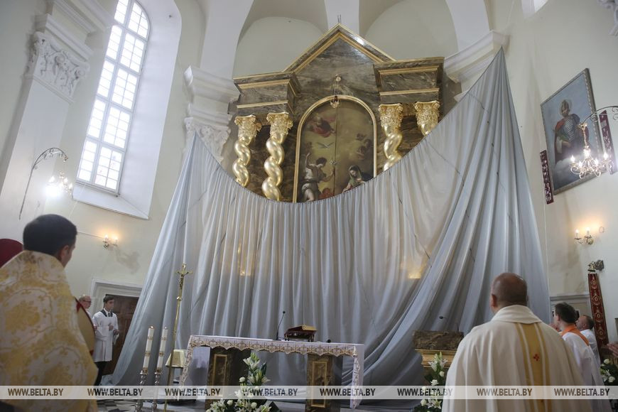 23 августа, Гродно /Корр. БЕЛТА/. Митрополит Минско-Могилевский архиепископ Тадеуш Кондрусевич освятил обновленный алтарь в костеле Благовещения Пресвятой Девы Марии (Бригитский костел) в Гродно. Сегодня состоялось торжественное открытие этого уникального алтаря XVII века. Гродненские мастера начали работы по восстановлению в сентябре 2019 года. Алтарь выполнен из камня и покрыт венецианской штукатуркой.-0-
