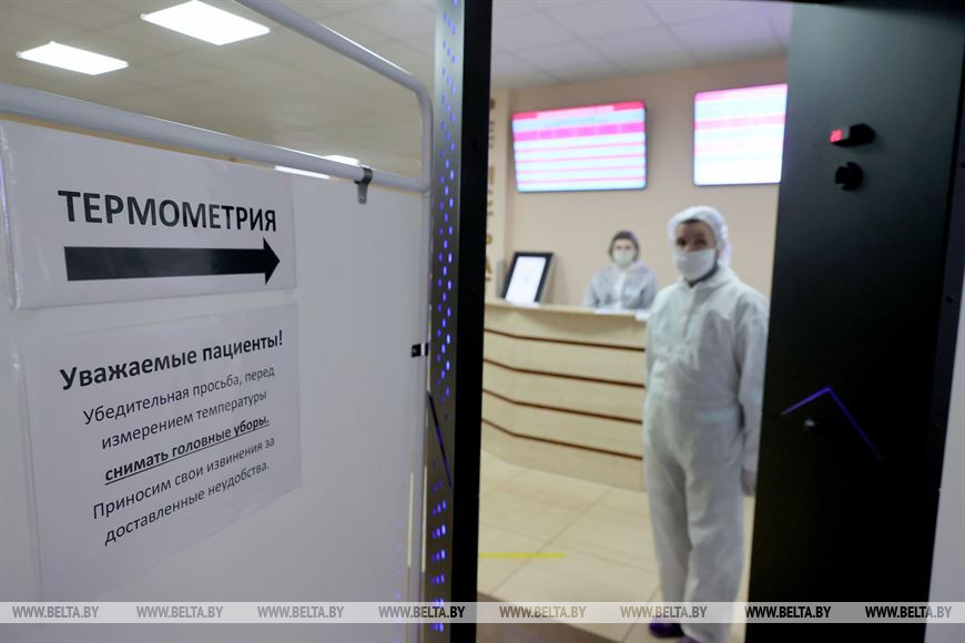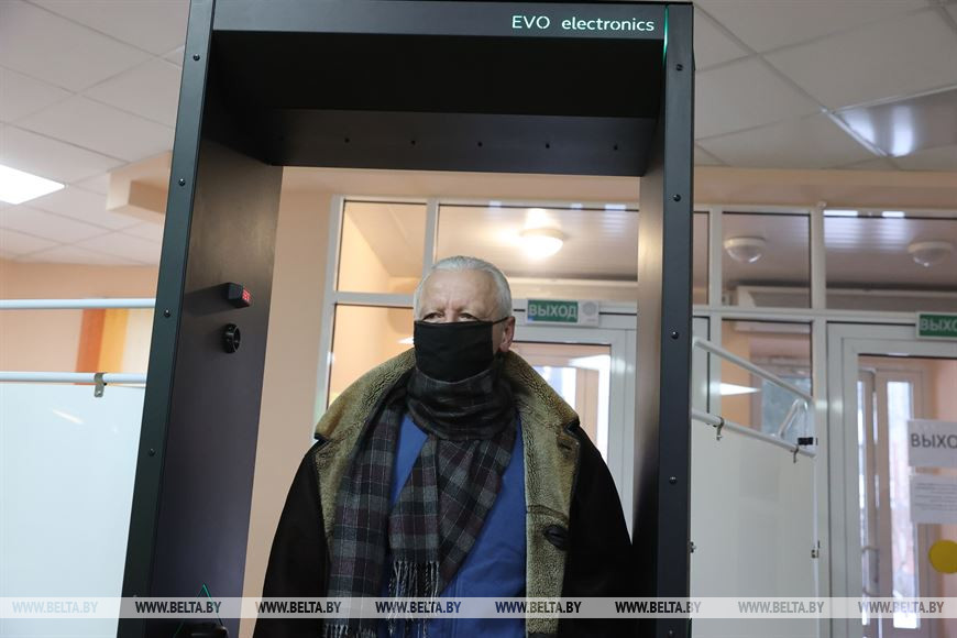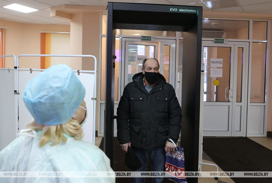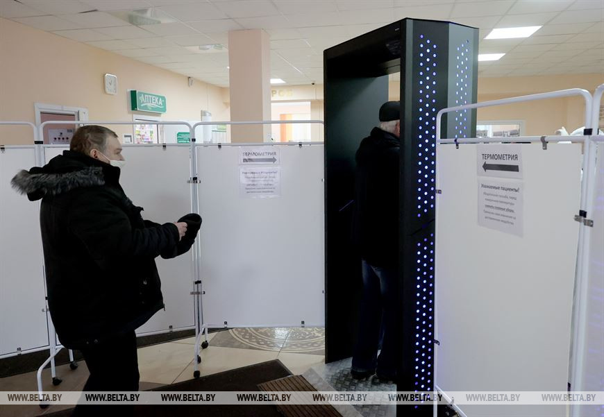 20 января, Витебск /Корр. БЕЛТА/. Первую термометрическую рамку для измерения температуры установили в Витебской центральной поликлинике. Устройство позволяет за доли секунды определить температуру тела человека с точностью до 0,3 градуса. Система тут же оповещает: если все в норме, то загорается зеленый цвет, если нет - красный. В рамку встроен сенсорный санитайзер для дезинфекции рук. -0-
