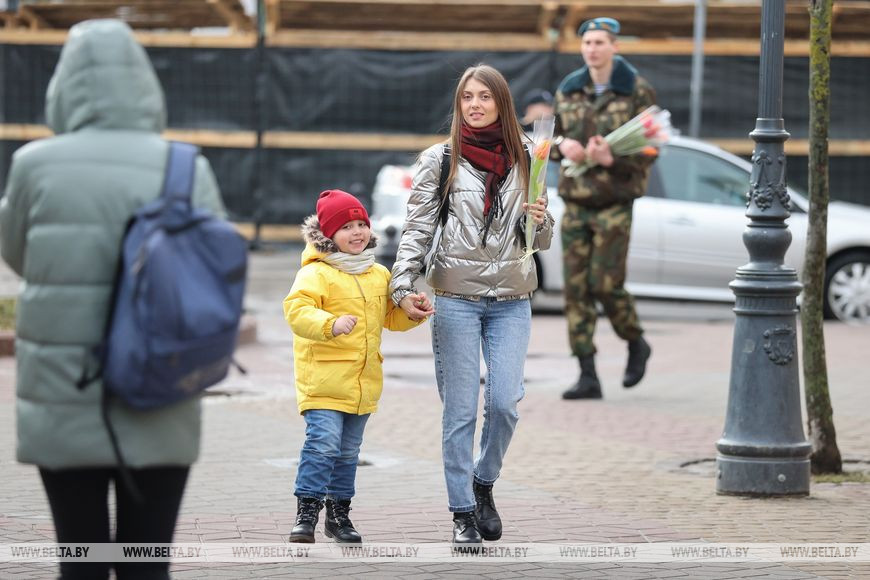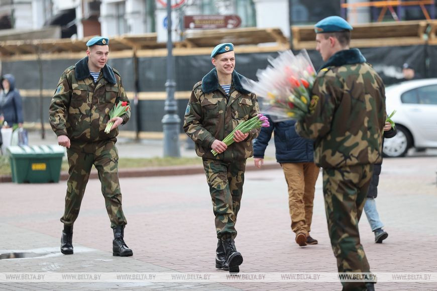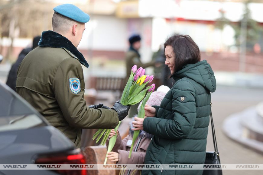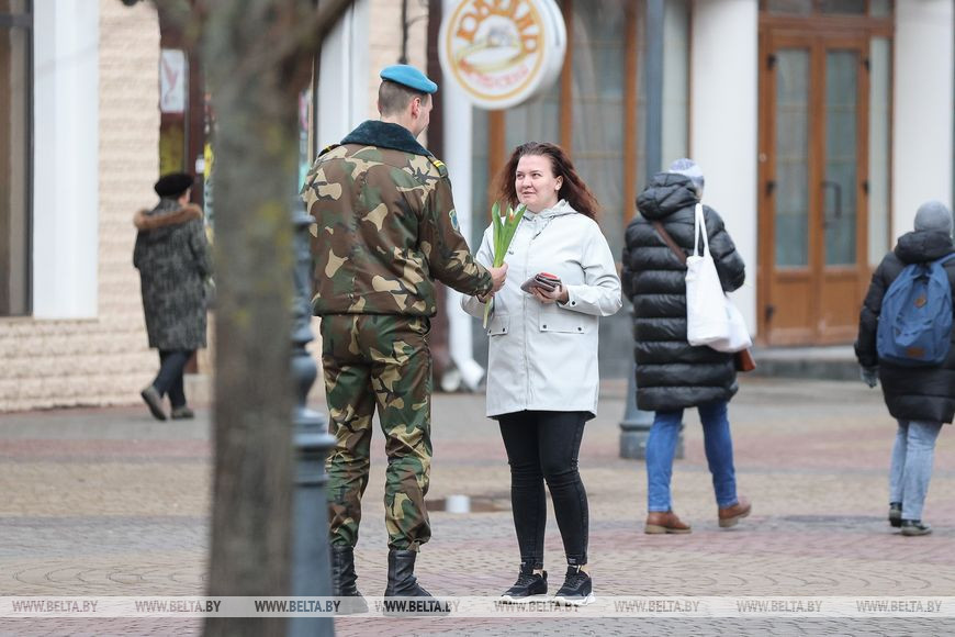 8 марта, Брест /Корр. БЕЛТА/. 8 марта в Бресте на улице Советской военнослужащие 38-й отдельной гвардейской десантно-штурмовой бригады поздравили женщин с праздником.-0-