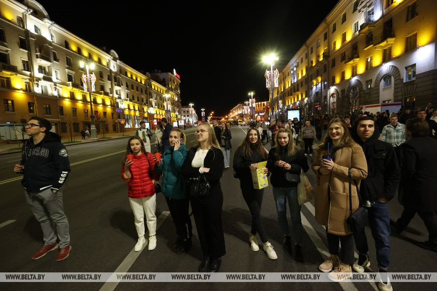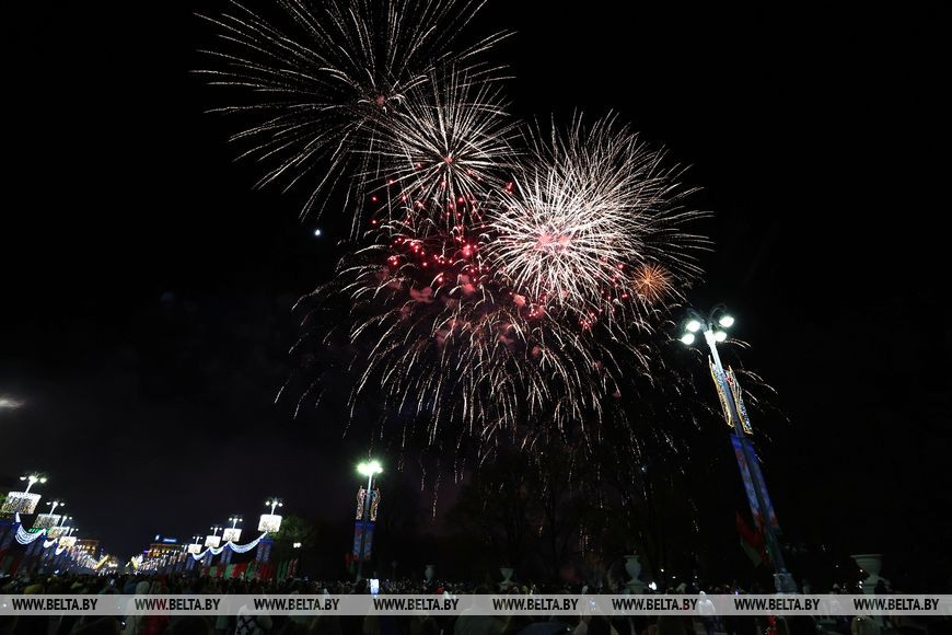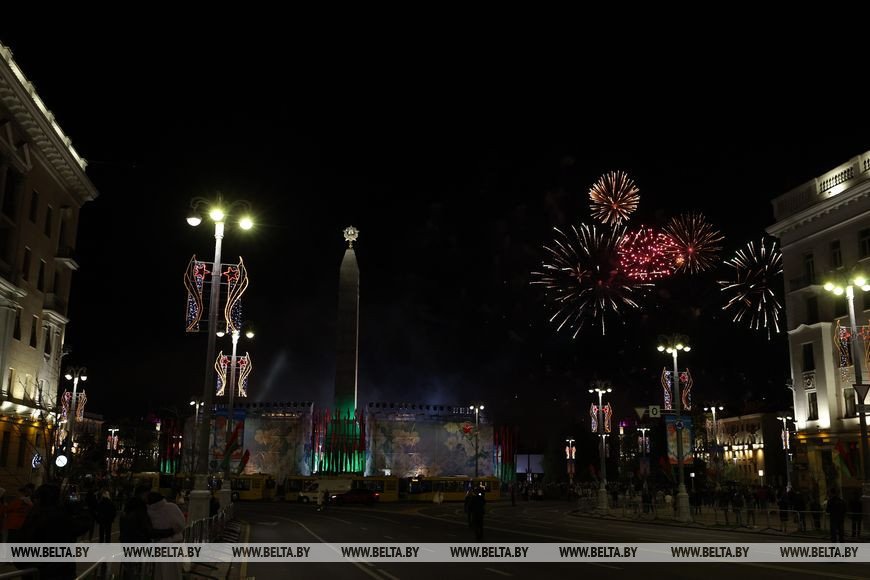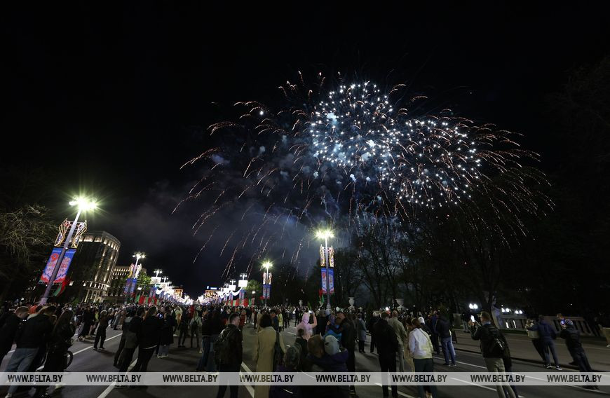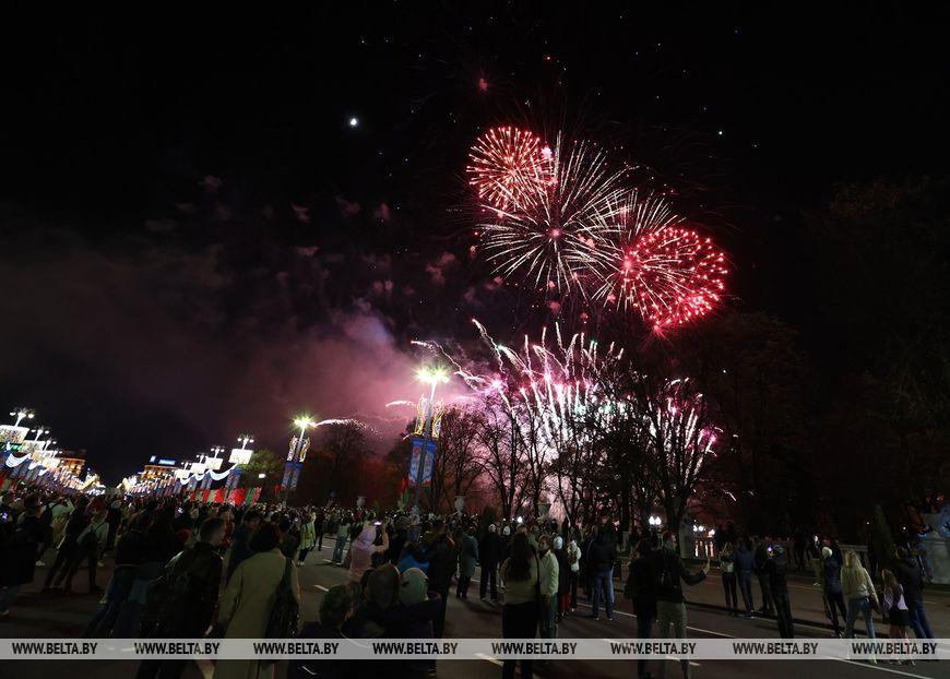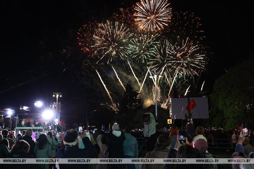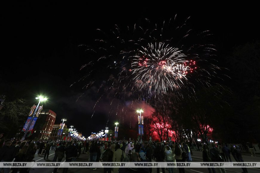 9 мая, Минск /Корр. БЕЛТА/. В День Победы праздничные фейерверки прогремели в шести точках Минска. Наблюдать за салютом можно было в парке Янки Купалы, на набережной в Дроздах, возле Национальной библиотеки, в городских парках имени Павлова и Уго Чавеса и в районе "Чижовка-арены".-0-