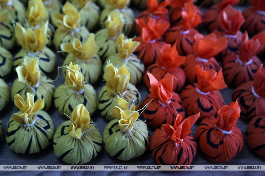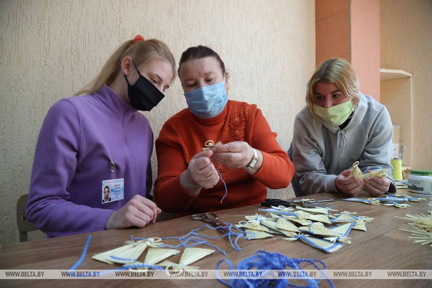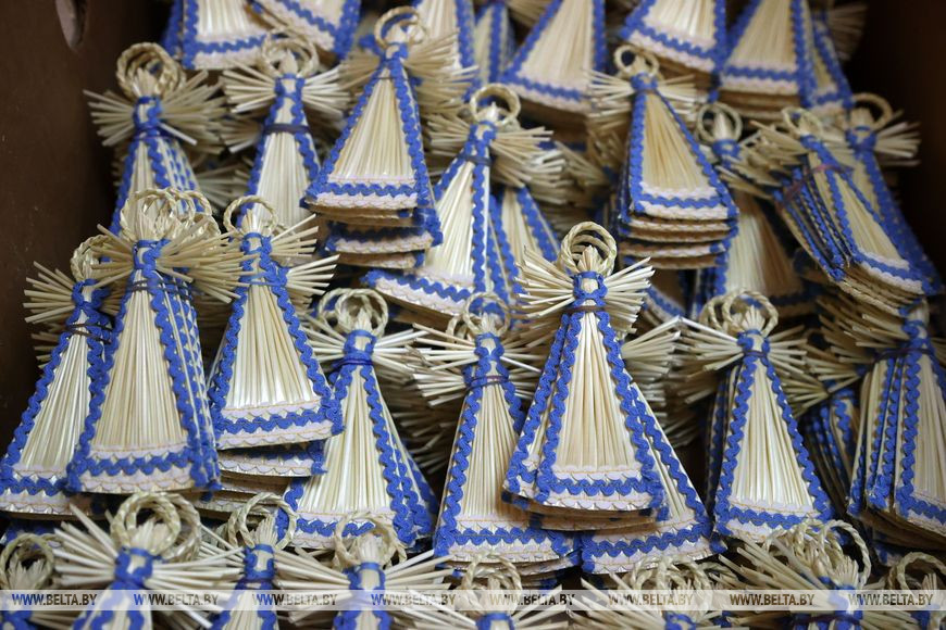 Соломенных ангелочков-оберегов к зимним праздникам сделают 1 тыс. штук. Эти легкие и воздушные фигурки теплого солнечного цвета с декоративной отделкой из голубой тесьмы можно вешать на елку, а также украшать ими свой дом. Получается красиво и необычно. "Фигурка ангелочка на вид проста в изготовлении, однако здесь тоже есть над чем потрудиться, - отмечает преподаватель народного творчества Людмила Римша. - Нужно сшить соломинки, прикрепить тесемочки, сделать крылышки и сплести нимбы. Для такой кропотливой работы нужна усидчивость. В зависимости от сноровки на изготовление одной фигурки уйдет от 30 минут до 1 часа. Образ соломенного ангела - это белорусские традиции создания оберегов, которые охраняли дом и семью от злых людей, болезней, дурного глаза. Тот, кто преподносит такой подарок, однозначно приходит в гости с добром и желает хозяевам здоровья и благополучия".