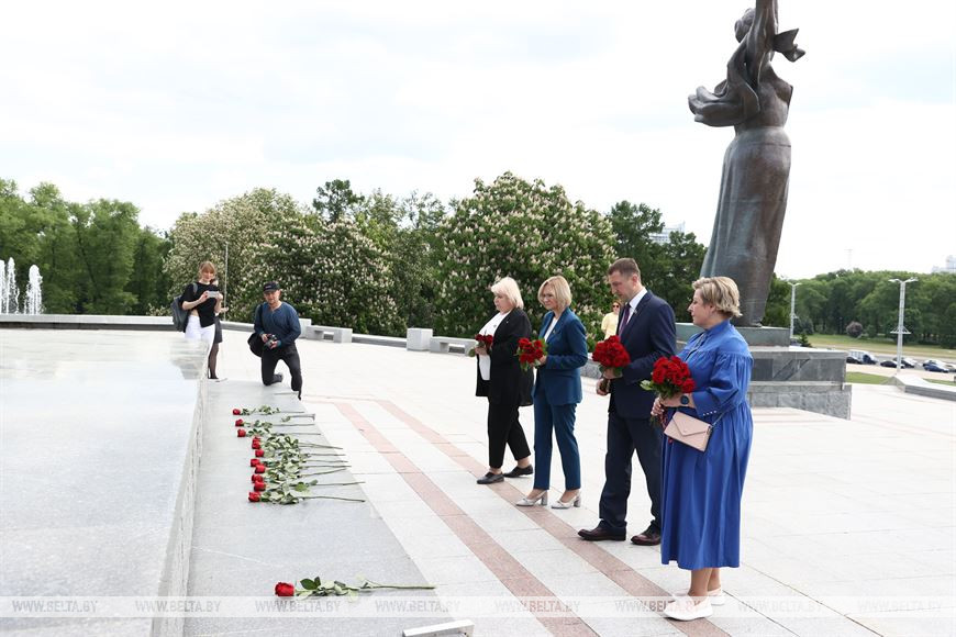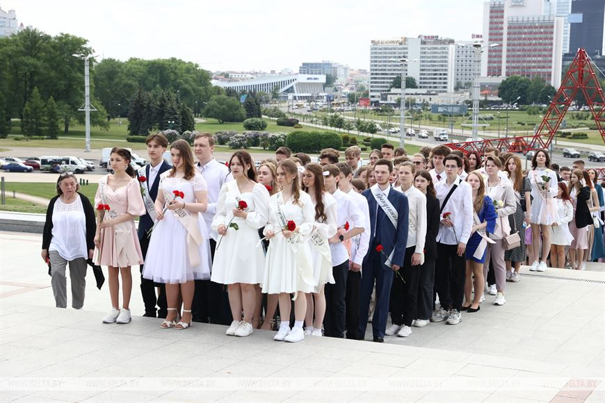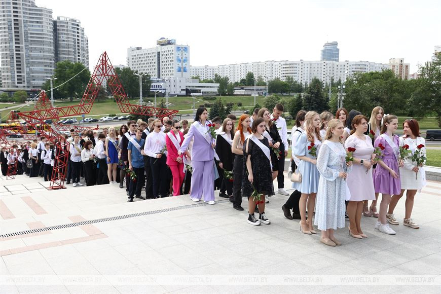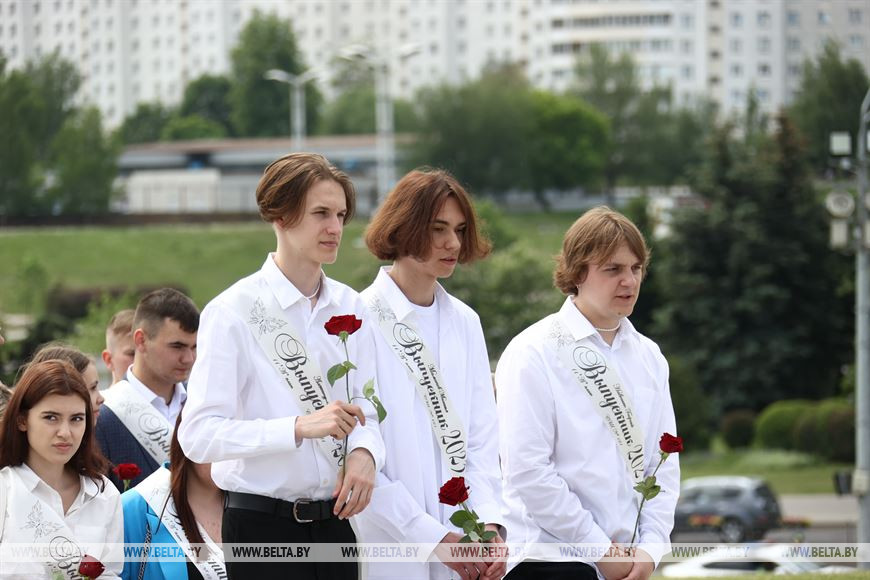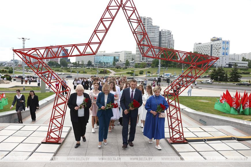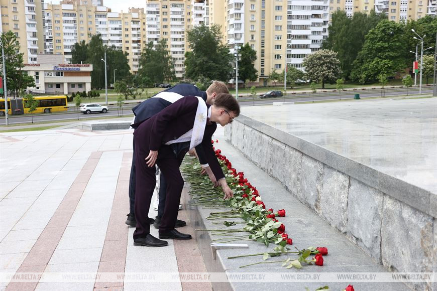 25 мая, Минск /Корр. БЕЛТА/. Руководство Мингорисполкома и столичные выпускники приняли участие в церемонии возложения цветов к стеле "Минск - город-герой".-0-