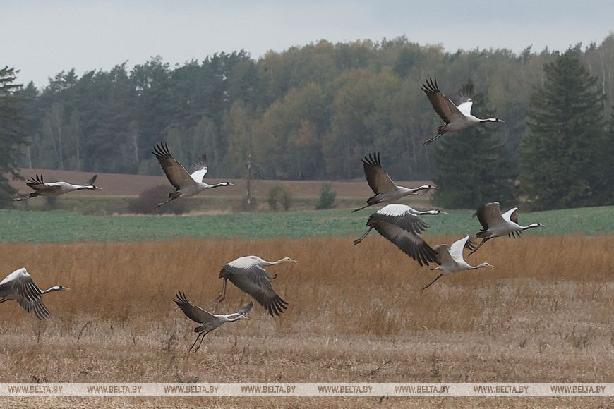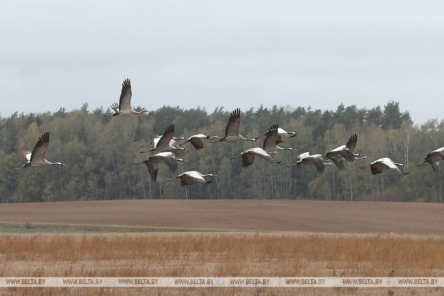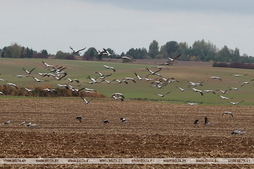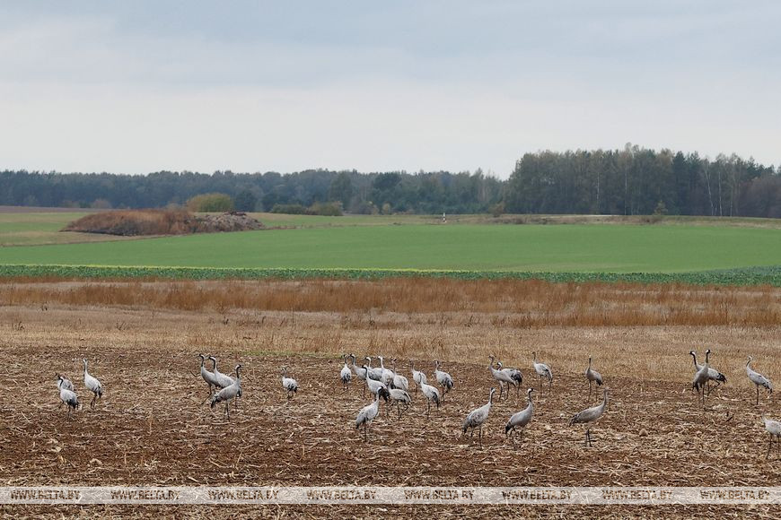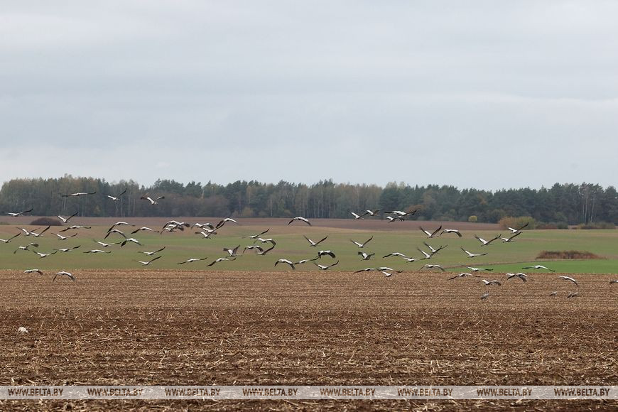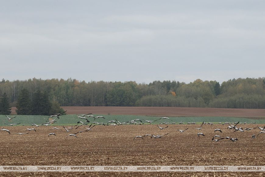 19 октября, Гродно /Корр. БЕЛТА/. Журавли собираются на полях в крупные стаи перед отлетом в теплые страны.-0-