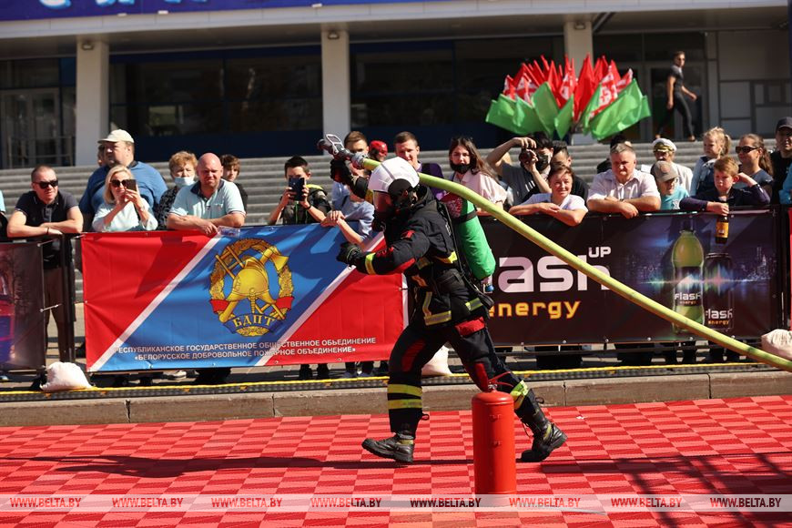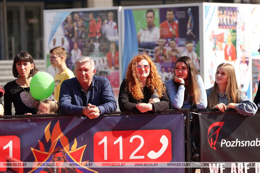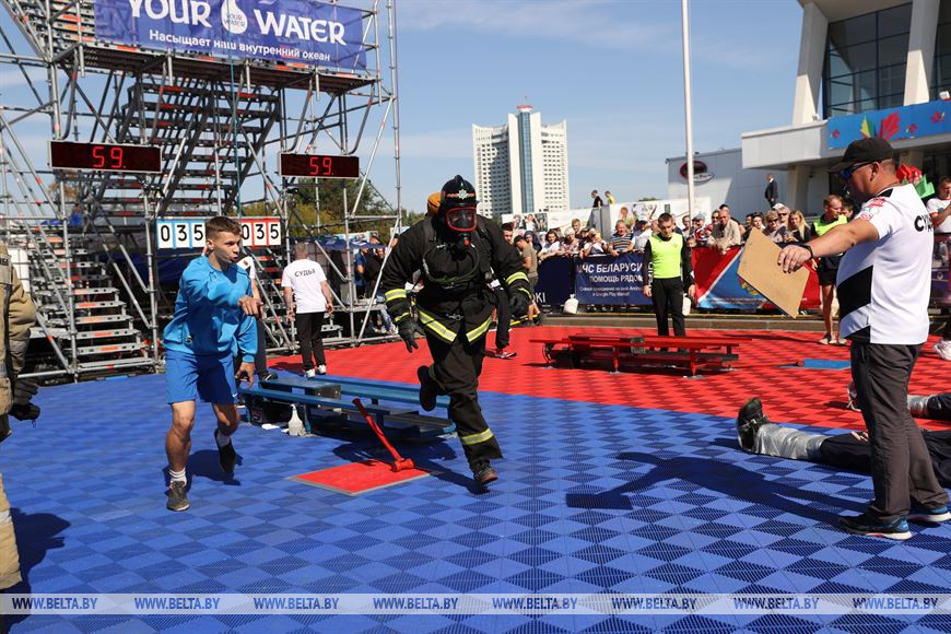 Международные соревнования "Сильнейший пожарный-спасатель" возле Дворца спорта