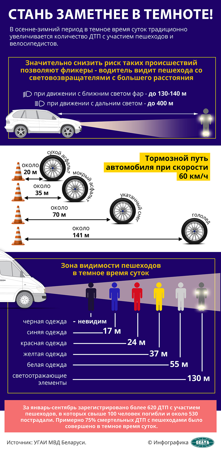 Госавтоинспекция напоминает, что двигаться по обочине пешеходам разрешается навстречу транспортному потоку и только там, где нет тротуара, пешеходной или велосипедной дорожки, а переходить проезжую часть нужно в установленном для этого месте, предварительно убедившись, что транспортное средство остановилось. В темное время суток для привлечения внимания водителей необходимо обозначить себя световозвращающими элементами. Это особенно важно при сложных погодных условиях, когда видимость дороги сокращается в несколько раз.