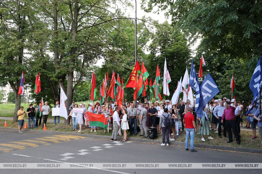 Сегодня около 150 белорусов собрались у посольства США в Минске выразить недовольство содержанием американского поздравления Республики Беларусь с Днем Независимости.