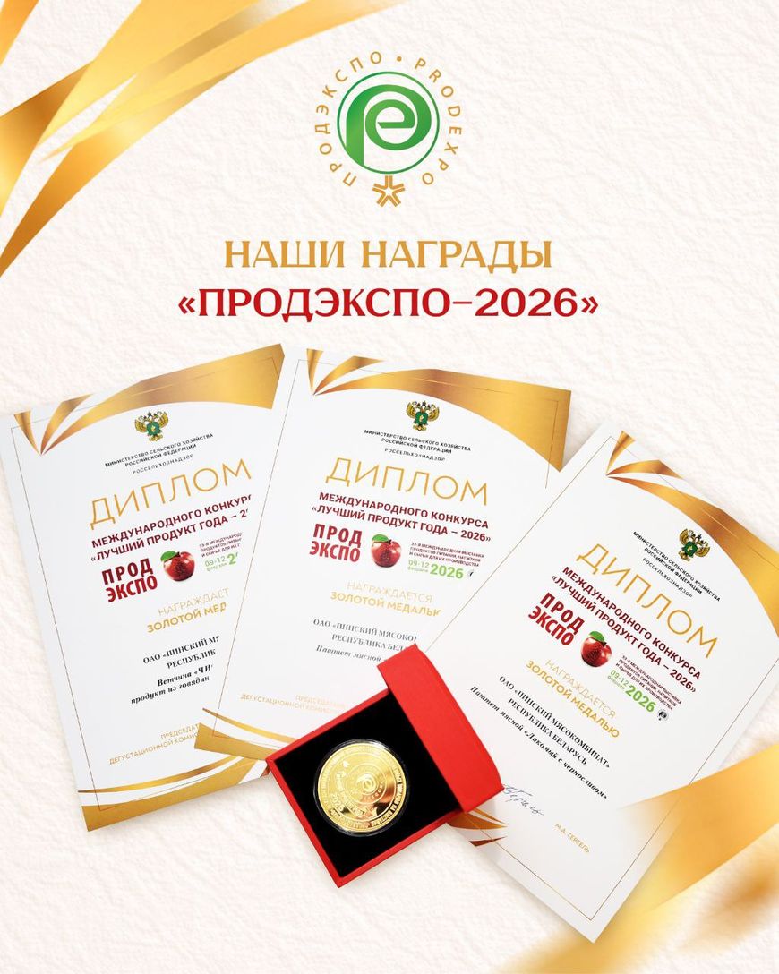 В рамках 33-й международной выставки продуктов питания, напитков и сырья для их производства "ПРОДЭКСПО 2026" в Российской Федерации в конкурсе "Лучший продукт года-2026" награждены дипломами и золотой медалью: