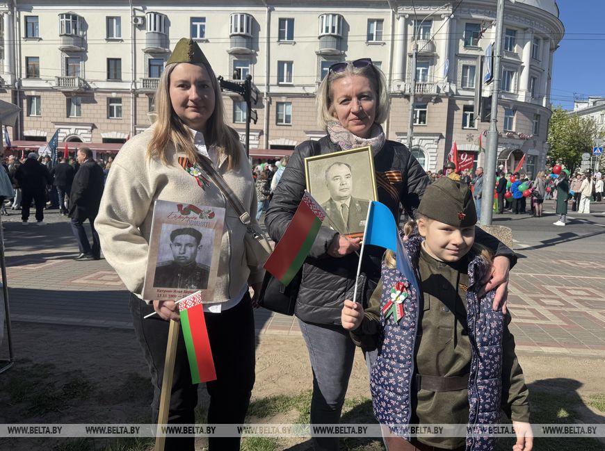 Своими героями-освободителями гордятся и гомельчанка Марина Богомазова, ее дочь Надежда, внученька Машенька. "Прапрадед Маши - Сойкин Иван Николаевич. Прошел всю войну. Был в группе СМЕРШ. Участвовал в параде на Красной площади 24 июня 1945 года. И уже в послевоенное время всегда либо участвовал в параде, либо смотрел его по телевизору. К сожалению, мне не удалось пообщаться с ним при жизни. Но знаю, что он - человек, который был отдан тому времени, мужественно защищал свою страну и будущие поколения. Мы очень гордимся им", - поделилась Марина Богомазова.