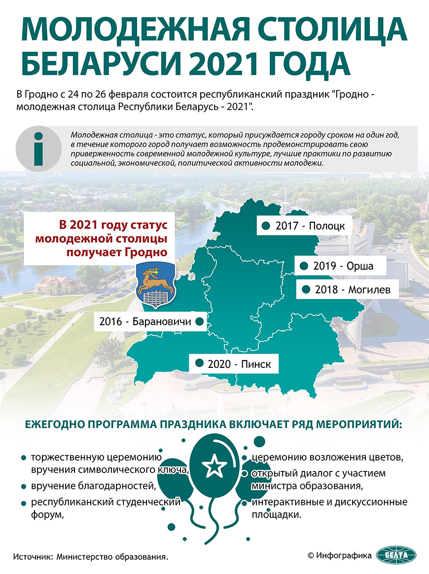 25 февраля, Гродно /Корр. БЕЛТА/. Гродно в 2021 году получил статус молодежной столицы. Сегодня в городе пройдет церемония открытия праздника, сообщили корреспонденту БЕЛТА в отделе идеологической работы и по делам молодежи горисполкома.