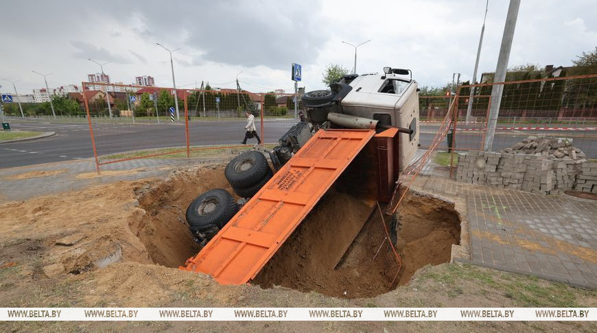 Водитель МАЗа близко подъехал к краю раскопки, где ведутся работы по прокладке канализации к микрорайону Грандичи-24, после чего произошел обвал грунта.