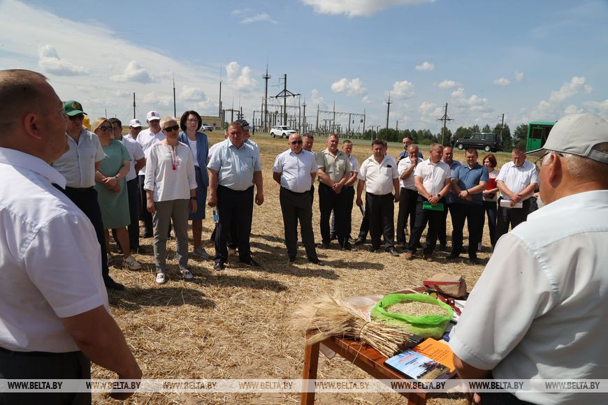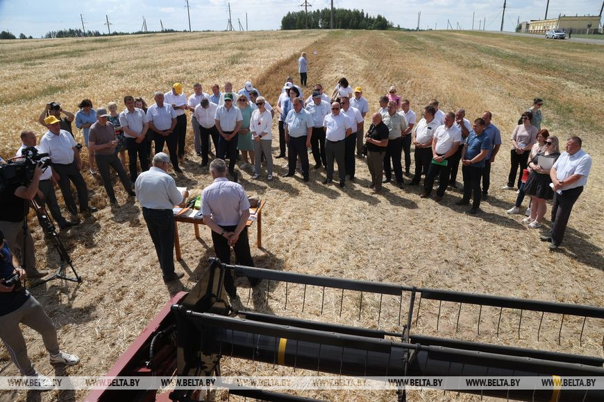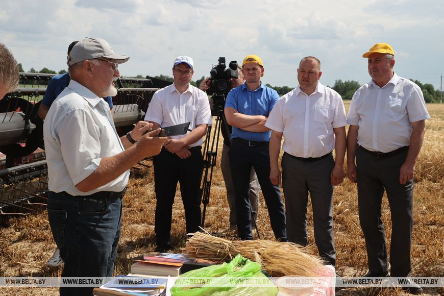 После обсуждения в райисполкоме участники семинара отправились на поля ОАО "Дужевка", где продолжили работу. Как рассказал руководитель предприятия Василий Ларченко, зерновые и зернобобовые культуры тут предстоит убрать почти с 1,6 тыс. га. "В уборке будет задействовано четыре зерноуборочных комбайна, сейчас оформили документы на получение нового комбайна в лизинг, скоро поедем забирать. В хозяйстве трудится 130 человек, в уборочной кампании будет задействовано 8 комбайнеров и помощников, 2 человека - на автомобиле "МАЗ" на отвозке, еще двое на пресс-подборщике и один на отвозке соломы, - рассказал он. - Погода засушливая, это не могло не отразиться на зерне. Уборка предстоит непростая. Но оптимизма мы не теряем, и другого пути у нас нет: раз посеяли, надо все убрать. Тем более что все, зависевшее от нас, мы сделали".