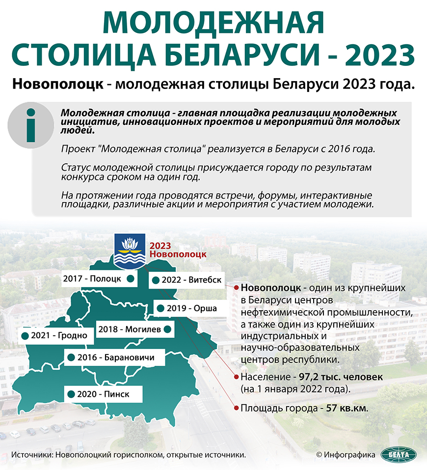 Сегодня Новополоцк принял от Витебска статус молодежной столицы и стал восьмым городом, который будет носить такое звание. "Это один из самых молодых городов нашей страны, ему в этом году исполняется 65 лет. Мы уверены, что вся молодежь - не только Новополоцка, но и всей республики - сможет познакомиться с историей города, учреждениями культуры и образования, которые находятся здесь. И самое главное: мы сможем еще раз продемонстрировать, какие условия созданы для того, чтобы каждый молодой человек мог найти свое место в жизни", - отметил Андрей Иванец.