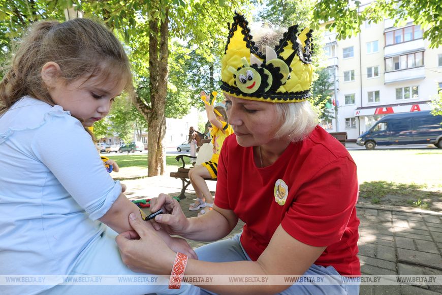 Пока старшие, будто пчелы, слетаются на мед, чтобы прикупить баночку-другую, детвора веселится на площади Скорины у фонтана. Для юных полочан организовали различные игры. В медовой эстафете из закрытой коробки с прорезанными отверстиями командам нужно было доставать частички "пыльцы" - пластиковые шарики, и победителями становились те, кто принес больше всех добычи. Детские коллективы Центра культуры "Полоцк" поделились своим творчеством, наполняя атмосферу праздника звонкими голосами. Взрослые и ребятишки охотно поучаствовали во флешмобе на пчелином танцполе.
