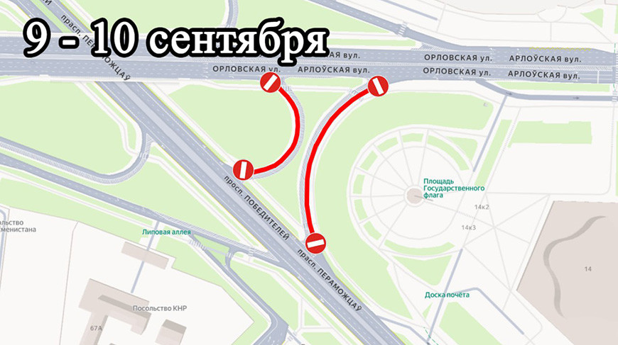 Полное ограничение движения транспорта будет вводиться с 21.00 9 сентября до 6.30 10 сентября по съезду с четной стороны пр. Победителей на четную сторону ул. Орловской из-за фрезерования существующего покрытия, устройства нижних и верхнего слоев асфальтобетонного покрытия, а также с 0.30 до 5.40 10 сентября по съезду с четной стороны ул. Орловской на четную сторону пр. Победителей из-за устройства нижних и верхнего слоев покрытия.