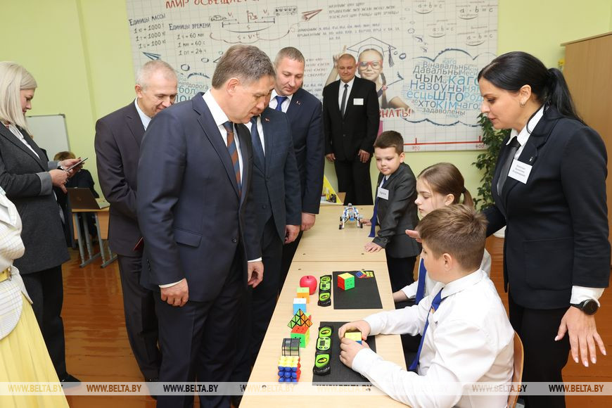 Игорь Петришенко встретился с юными техниками, которые занимаются в секции робототехники. Вице-премьер напомнил, что в Беларуси есть детский технопарк, где всегда рады инновационным идеям мальчишек и девчонок. Несколько лет в школе практикуют ментальную арифметику, проводят занятия по робототехнике.