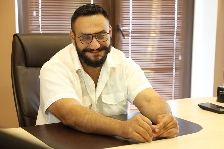 Миновав аллею с деревьями и аккуратно постриженным кустарником, видим ту самую "контору", на пороге которой нас уже ждет директор. Непривычно видеть в роли управленца хозяйством мужчину с внешностью восточного красавца киноактера. Но спустя 10 минут после беседы понимаешь: он на своем месте и детально разбирается в тонкостях сельского хозяйства.