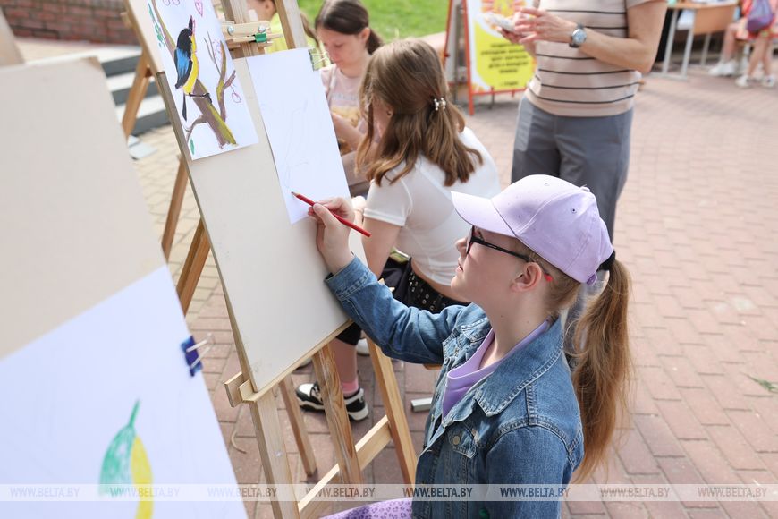 Неподалеку за столиками сидели группы девчонок и мальчишек из кружка изобразительного искусства средней школы №16. Девятиклассница Настя Мосейчук и две сестренки-близняшки Алена и Настя Герасимчик рисовали исторический центр Гродно - такое получили задание. Но праздник так и манил их взгляд, и на бумаге рядом с красивыми пейзажами появлялись детские фигурки и картинки с локаций. "Как только сделаем свои наброски, сразу туда", - сказали девчонки. И мы не стали их отвлекать: воспользоваться таким шансом на старте каникул не только интересно, но и полезно.-0-
