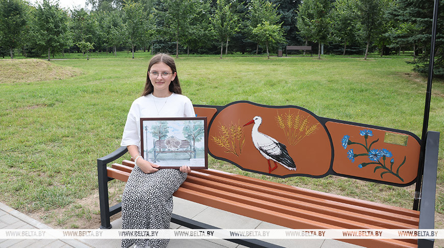 Ученица школы №225 Ангелина Тупикина рисует с самого детства. Принять участие в соревновании ей предложил преподаватель. На эскиз скамейки Ангелина потратила около двух недель. "При написании этой картины меня вдохновляла красота родного края. Поэтому получилась не простая скамейка, а скамья, смотря на которую, ты узнаешь свою страну. Все мы знаем, что аист - это главный символ Беларуси, символ миролюбия и мудрости, поэтому он находится в центральной части скамейки. Наш родной край знаменит своими зелеными полями. Я изобразила колосья и васильки - цветы, часто встречающиеся на наших просторах", - поделилась художница.