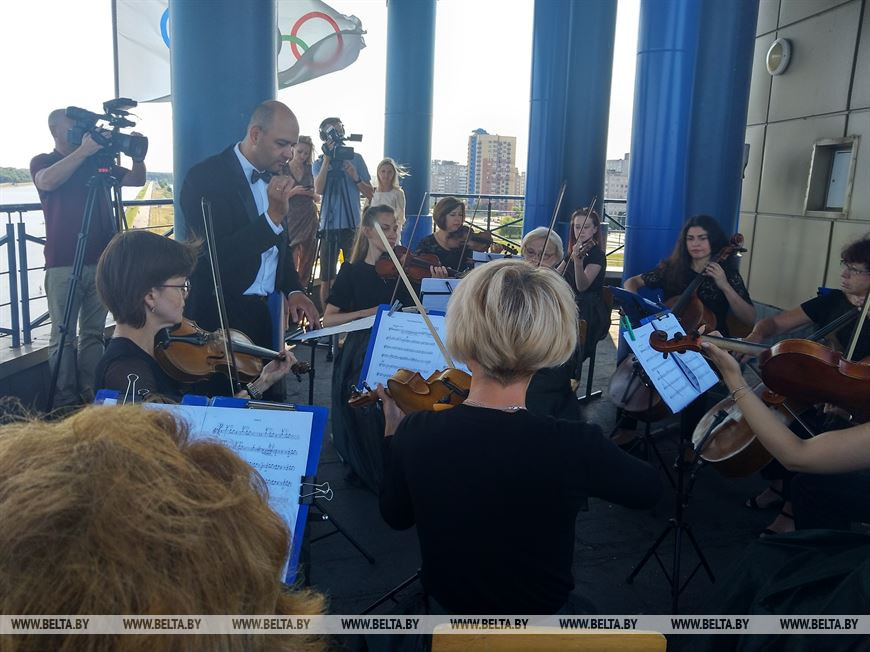Музыканты расположились на самой высокой точке гребного канала - шестом этаже административного здания, так называемой судейской башне. Гуляющий на площадке ветер и другие не самые лучшие для выступления условия не помешали коллективу выполнить творческое задание на высоком профессиональном уровне. За четверть часа оркестр сыграл с десяток популярных композиций. В частности, в исполнении музыкантов прозвучали попурри на темы "Битлз", танго "Прощай, Париж" Астора Пьяцолла, Soul Bossa Nova Куинси Джонса и другие.