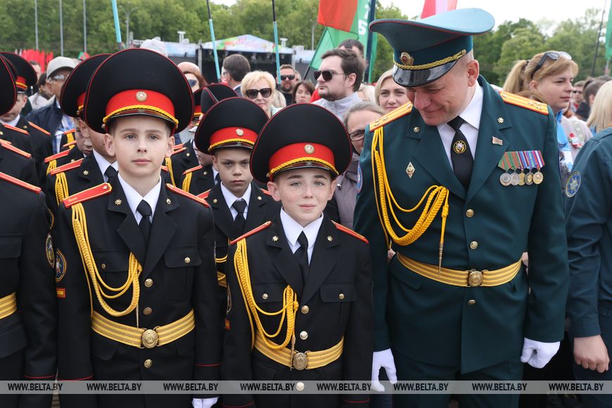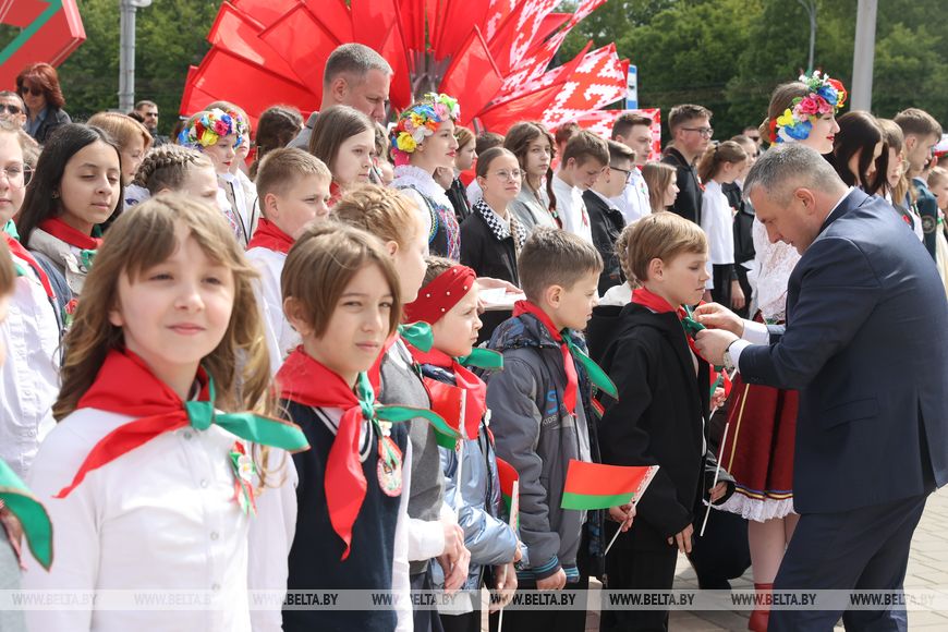 С этого дня пионерский галстук с гордостью будет носить гомельчанка Настя Пихутина. "Конечно, немного волнительно в такой атмосфере получать пионерский галстук, но очень почетно. Я - отличница в школе, участвую в разных конкурсах, занимаюсь творчеством, у меня много разных поделок. Мечтаю быть учителем, как моя мама. А всей нашей красивой стране желаю благополучия и процветания", - сказала девочка."Очень горжусь нашим флагом, люблю нашу страну. И готов совершать для нее много добрых, полезных дел", - включился в диалог четвероклассник Вадим Симанчук.