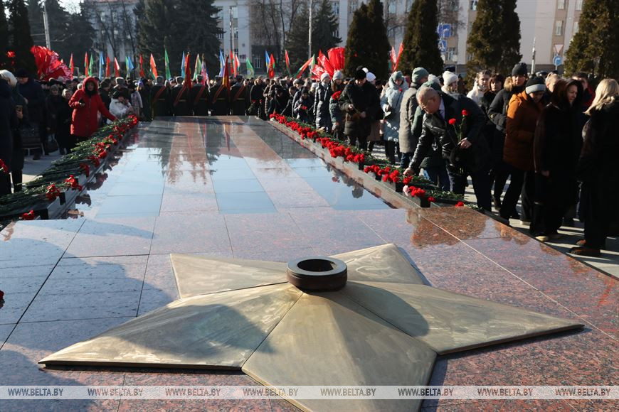 У Вечного огня на площади Труда областного центра собрались ветераны, руководство области, города, парламентарии, воинские подразделения, трудовые коллективы, представители общественных организаций, молодежь.