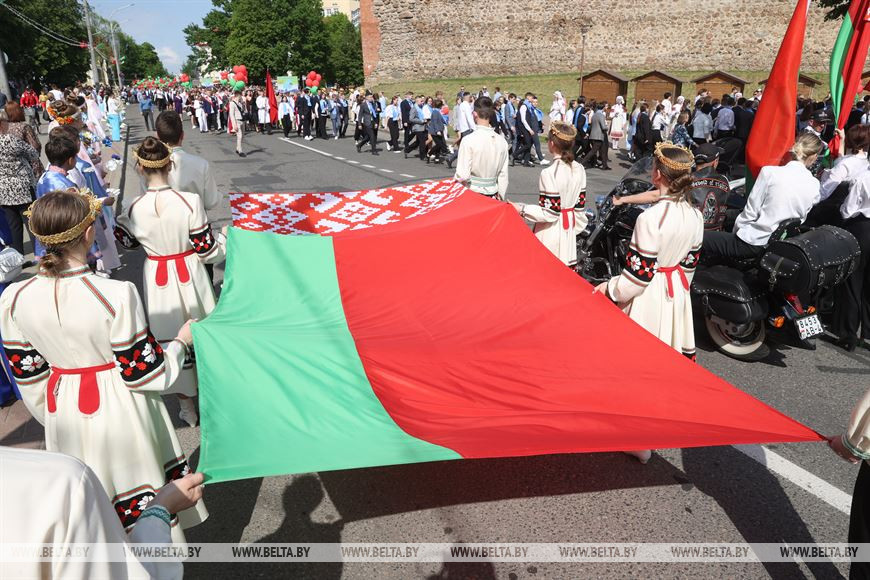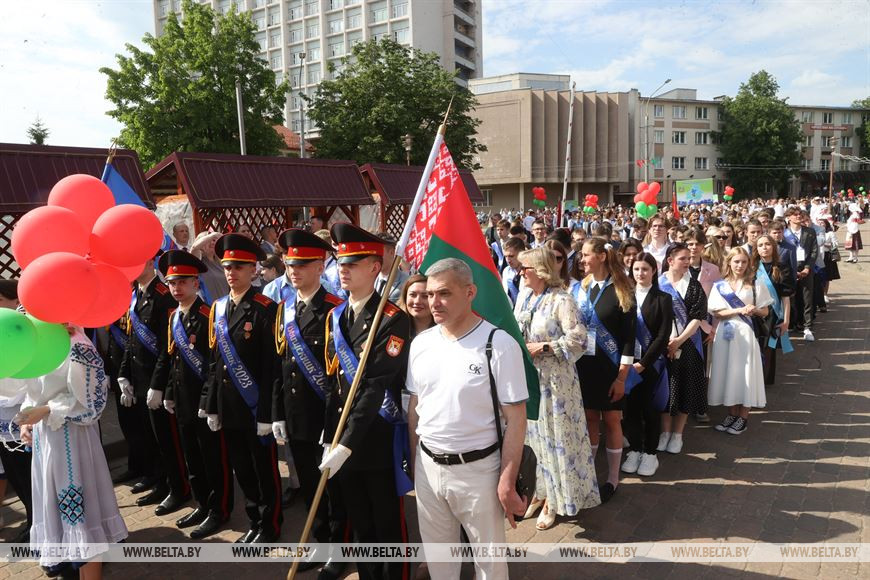 Начался главный праздник лучших выпускников 2023 года у Кургана Бессмертия, где молодежь вместе с представителями системы образования страны и региона возложили цветы к символу величия победителей и памяти героев. Оттуда началось торжественное шествие школьников к одной из основных площадок праздника - Лидскому замку. Школьники и творческие коллективы города встречали выпускников на протяжении всего их пути с цветами, воздушными шарами и художественными номерами.