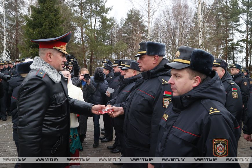 24 ноября, Могилев /Корр. БЕЛТА/. Торжественная церемония награждения к 100-летию со Дня образования службы участковых инспекторов милиции прошла в Могилевском районе. Она собрала на мемориальном комплексе "Батальон милиции под командованием К.Г.Владимирова" в деревне Гаи сотрудников органов внутренних дел со всего региона, передает корреспондент БЕЛТА.