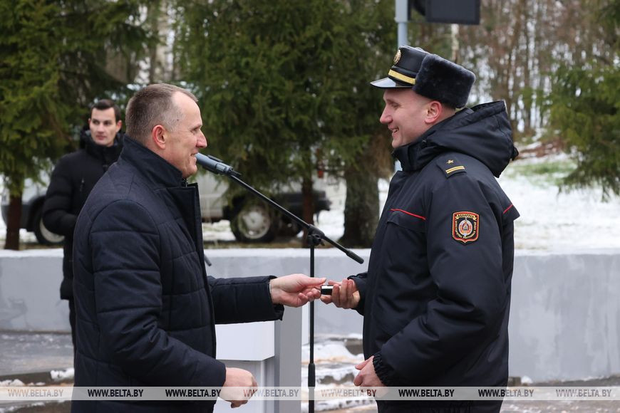 Участники мероприятия возложили цветы к братской могиле, отдав дань памяти и уважения бойцам легендарного милицейского батальона, почтили погибших героев минутой молчания. Лучшим из лучших вручены награды и благодарности, а победителю областного смотра-конкурса профессионального мастерства участковых инспекторов милиции достался служебный автомобиль. Сертификат на новый и комфортный транспорт, а также искренние поздравления принимал старший участковый отдела милиции Ленинского района Бобруйска Иван Заблоцкий.-0-