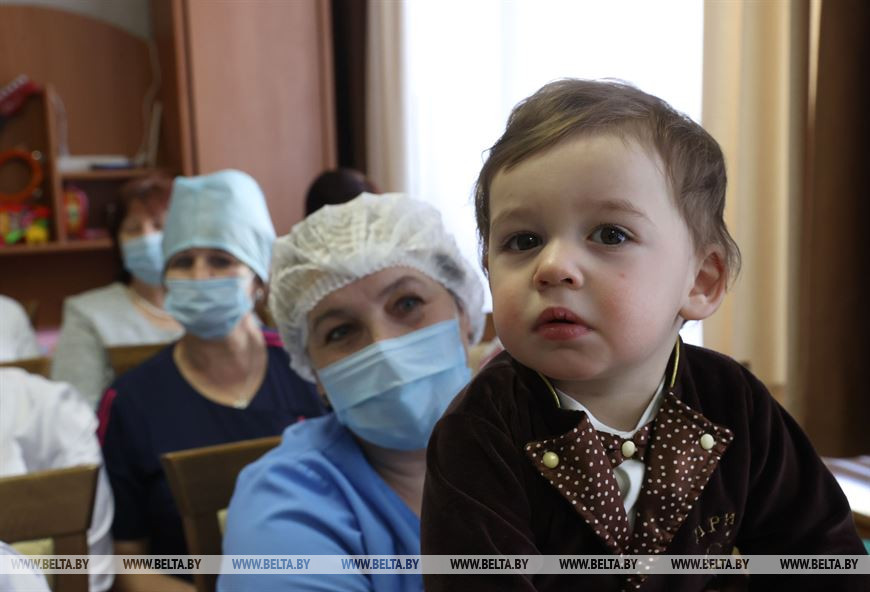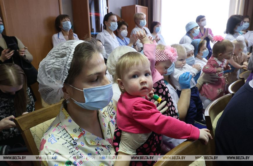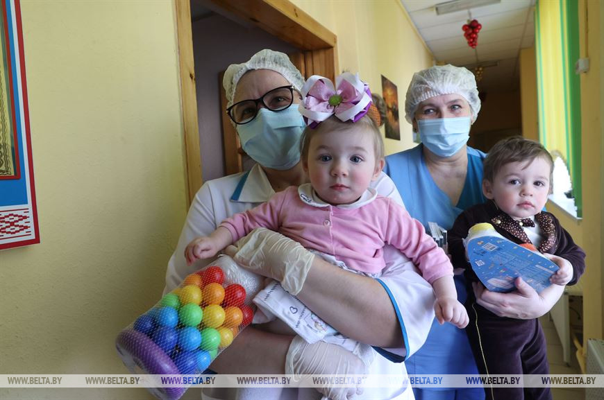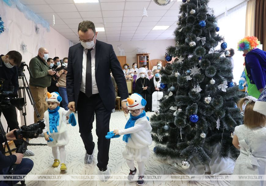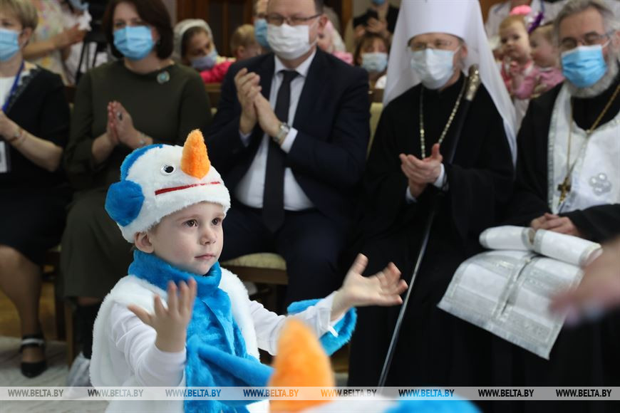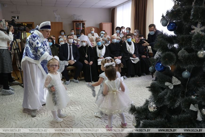 10 января, Минск /Корр. БЕЛТА/. Митрополит Вениамин и министр здравоохранения Дмитрий Пиневич сегодня стали гостями теплого рождественского утренника в Доме ребенка №1, где поздравили малышей и коллектив с праздниками, одарили вниманием и заботой тех, кому добрые медсестры и врачи заменили родителей, передает корреспондент БЕЛТА.