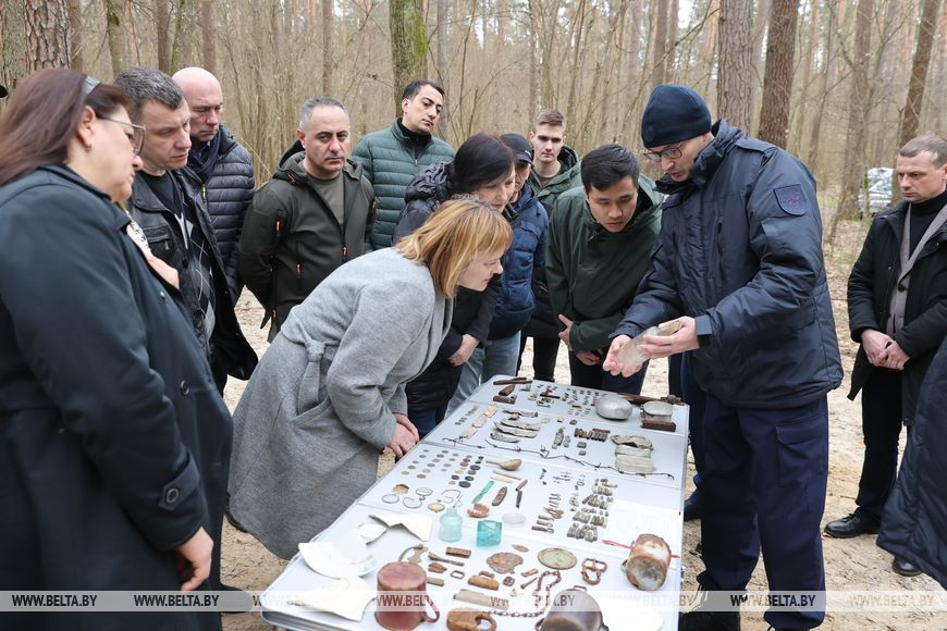 Делегация военных атташе из 11 стран с двухдневным визитом посетила Гомельскую область. Сегодня для гостей организовали маршрут с особой значимостью, во время которого ознакомили с ходом расследования уголовного дела о геноциде белорусского народа в годы Великой Отечественной войны. Военные атташе побывали на месте раскопок в Ченковском лесу Гомельского района, где из расстрельных ям спустя десятилетия поднимают останки в основном мирных людей - жертв фашизма. Исторический экскурс обозначил прокурор Гомельской области Виктор Морозов. Он пояснил, что с начала раскопок из глубины подняты останки более 800 безвинно погибших. Эта работа продолжается. Также дипломаты возложили цветы к мемориалу военно-исторический комплекс "Партизанская криничка".