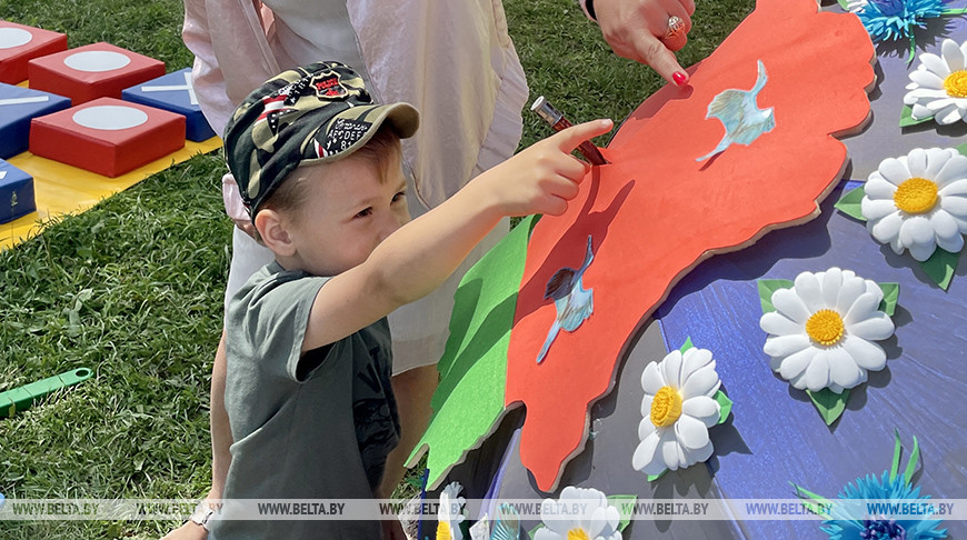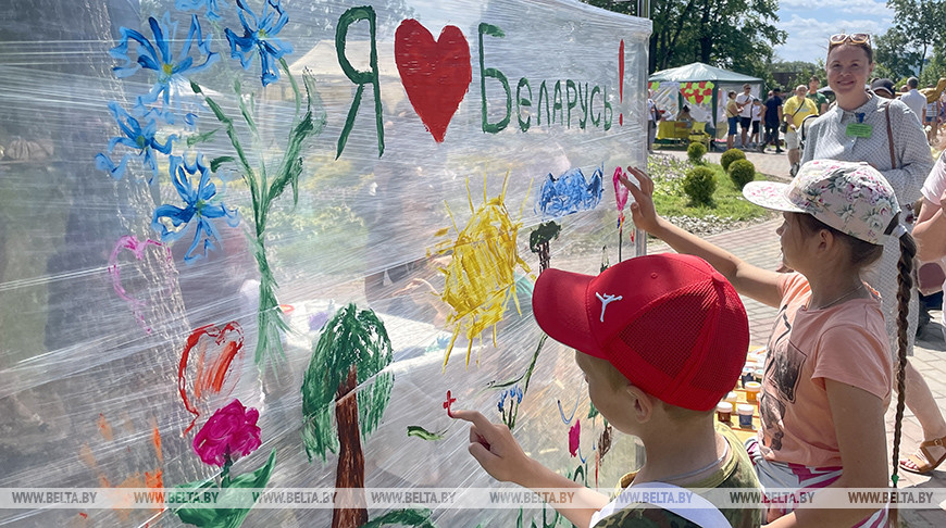 В парке сегодня получился поистине семейный праздник. Вкусные угощения от предприятий города, десятки локаций от учреждений образования и дополнительного образования никого не оставляют равнодушными: здесь можно сделать аквагрим, поиграть в большие крестики-нолики, поучаствовать в различных мастер-классах. Маленький Оскар Титов с мамой Аленой основательно подготовились к празднованию - они пришли в тематических футболках с белорусской символикой. Оскар рассказал, что уже сделал праздничную открытку. "Праздник нравится, тут очень интересно!" - поделился мальчик.