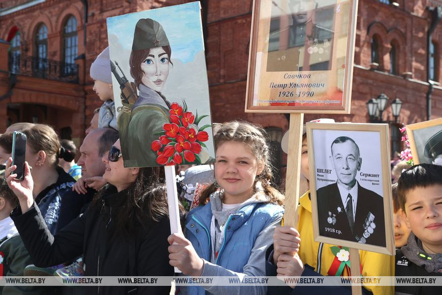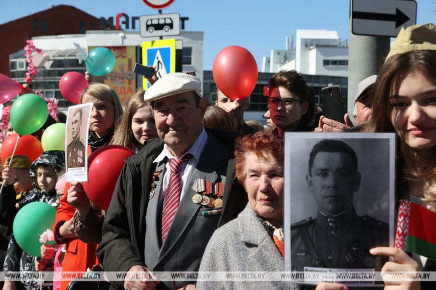 "День Победы - необыкновенно важный и удивительный праздник, который нужен людям. Они должны понимать, что родная страна - самая любимая и самая хорошая, ее нужно защищать и уметь за нее постоять, - сказала Татьяна Ларина. - Сегодня на праздник я пришла с портретом в руках: это брат моей бабушки Миша. В 16 лет он ушел в партизанский отряд, там и погиб. Более 70 лет родственники искали его могилу и даже не знали, где он похоронен. А потом благодаря тому, что появились сайты с документами, мы узнали, что его могила находится в 70 км от дома в деревне Ухлясть Быховского района. И сегодня этот мальчик впервые пришел на парад".