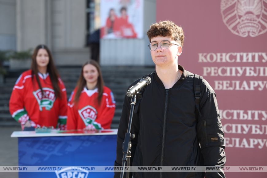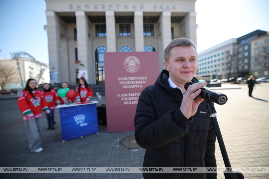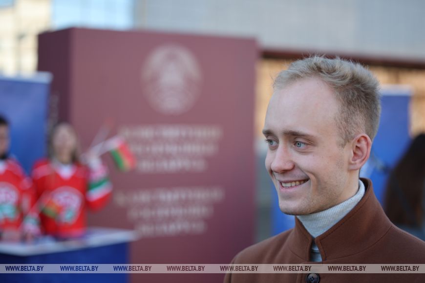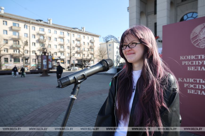 Студент Минского технологического колледжа Илья Сандрыгайло поделился тем, что любит Беларусь за людей и возможность заниматься любимым делом. "А еще Конституция обязывает ко многому. Я знаю, что есть правила, которые нужно соблюдать. Тогда в стране будет порядок. Уверен, что если не было бы Конституции, был бы хаос", - говорит парень.Никита Масальский учится в Минском государственном механико-технологическом колледже и пришел на акцию, чтобы громко в микрофон признаться в любви своей любимой стране. "Я люблю свою страну за возможность вот так открыто озвучивать свои мысли. И это в том числе заслуга того, что у нас есть своя Конституция, в которой закреплены законы и обязанности граждан страны. Сегодня без Конституции никуда. Для меня в первую очередь это безопасность, стабильность и уверенность в завтрашнем дне", - сказал Никита.