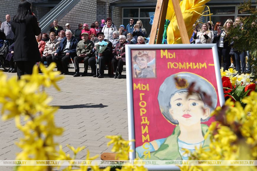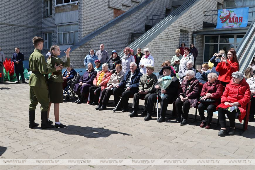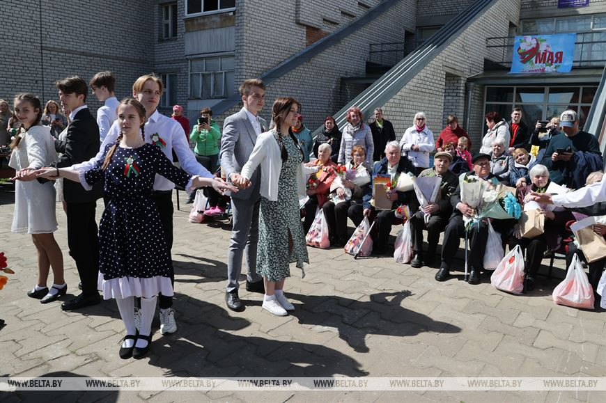 Импровизированная сцена развернулась на открытой площадке напротив Могилевского специального дома для ветеранов, престарелых и инвалидов. Все празднично украшено, организована тематическая выставка с детскими рисунками на тему Великой Победы. В программу молодежного мини-концерта вошли много теплых и душевных музыкальных, театрализованных и хореографических номеров, посмотреть которые пришли даже жители близлежащих домов. Могилевчане поздравляли друг друга с 9 Мая, пели вместе с исполнителями любимые всеми поколениями песни - "Катюшу", "Старый клен", "Песенку фронтового шофера". Не обошлось, конечно же, и без знаменитого "Майского вальса" и "Дня Победы".