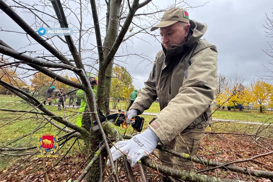 "Сегодня мы работаем в очень красивом месте, которое даже сейчас, в осеннее время, выглядит эстетично. Где-то сад камней, где-то самшиты, тропы здоровья. Женщины убирают листья, мужчины обрезали деревья, кустарники, придавая им оригинальную форму, провели санитарную чистку территории. Лесхоз обеспечил необходимой техникой. Высадили деревья", - рассказал глава облисполкома.