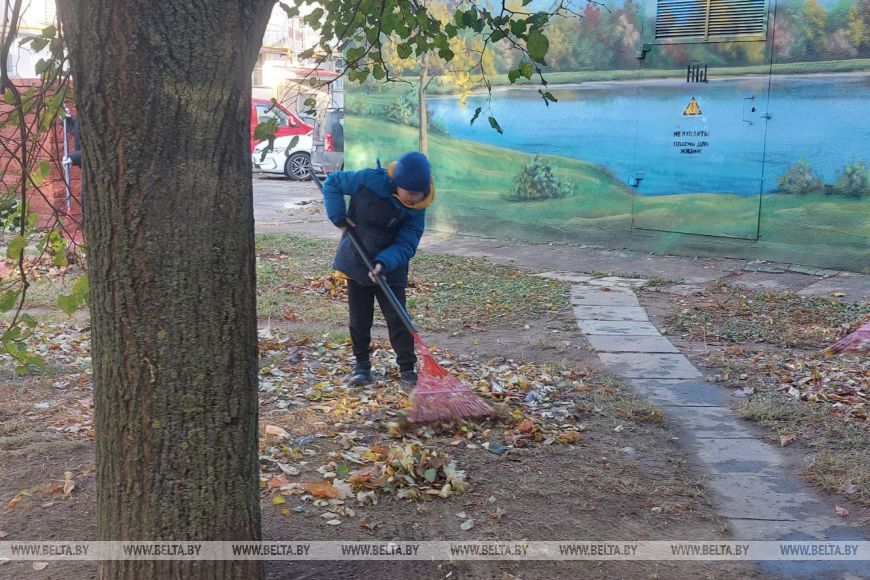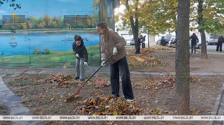 В Советском районе во дворе на бульваре Мулявина к уборке присоединилось большое количество молодежи. Оказалось, что это участники волонтерского отряда при учебном заведении - они пришли под руководством директора минского финансово-экономического колледжа Оксаны Бесько.